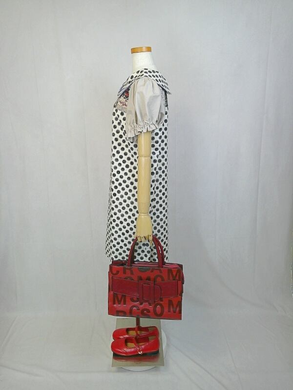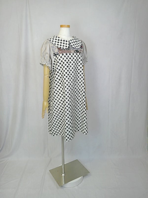 手書き風水玉模様のワンピースのデコルテ部分に用いた、高級感のあるパッチワークのようなプリント生地や、袖に使用した落ち着いたくすみグレーの無地生地との組み合わせが、すっきりと広がるミディ丈スカートのシルエットとともに、オシャレな大人の雰囲気を演出しています。