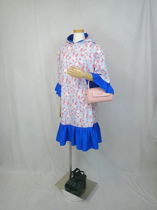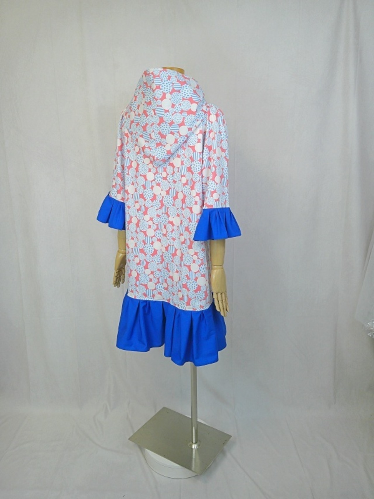 ピンク地に大きなドット柄、中にストライプや水玉柄が描かれた生地のオシャレ感のある雰囲気を、袖口と裾に施したフリルが生み出すふんわり感が、大人のかわいらしさを演出しています。