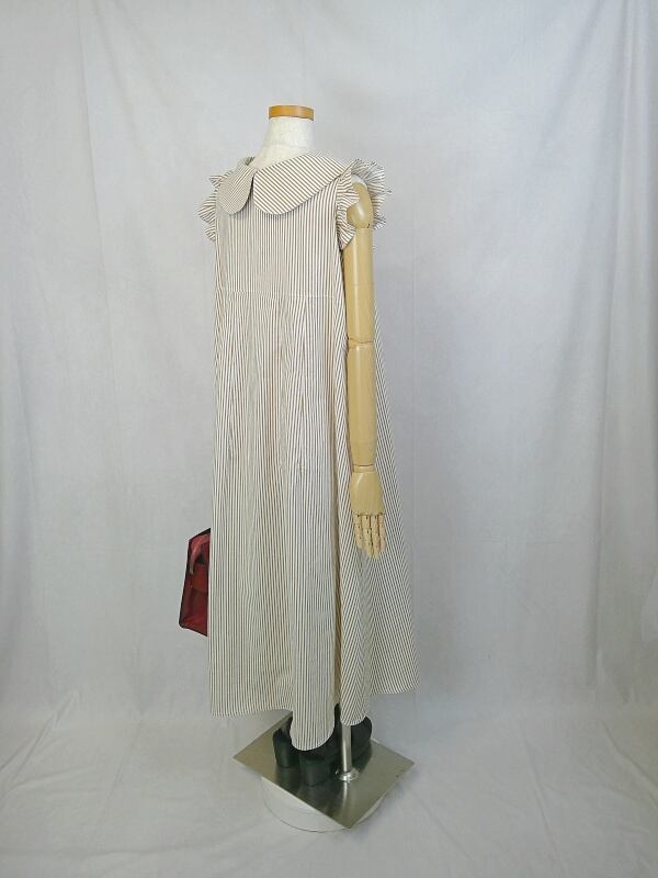丸襟ワンピース 【HWT00000037】 ★白とベージュのすっきりとしたストライプ柄が上品な、かわいい袖フリルのスリーブレス丸襟ワンピース★ 手作り 一点物 快適 通勤 通学 ビジネス 締め付けない 国産 日本製