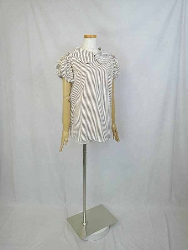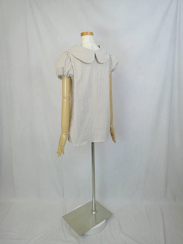 丸襟ブラウス 【TOP00000189】 ★小さめバルーン袖がかわいい、すっきりストライプ柄の丸襟ブラウス★ 一点物 快適 通勤 通学 ビジネス 締め付けない 国産 日本製 コットン100% 半袖