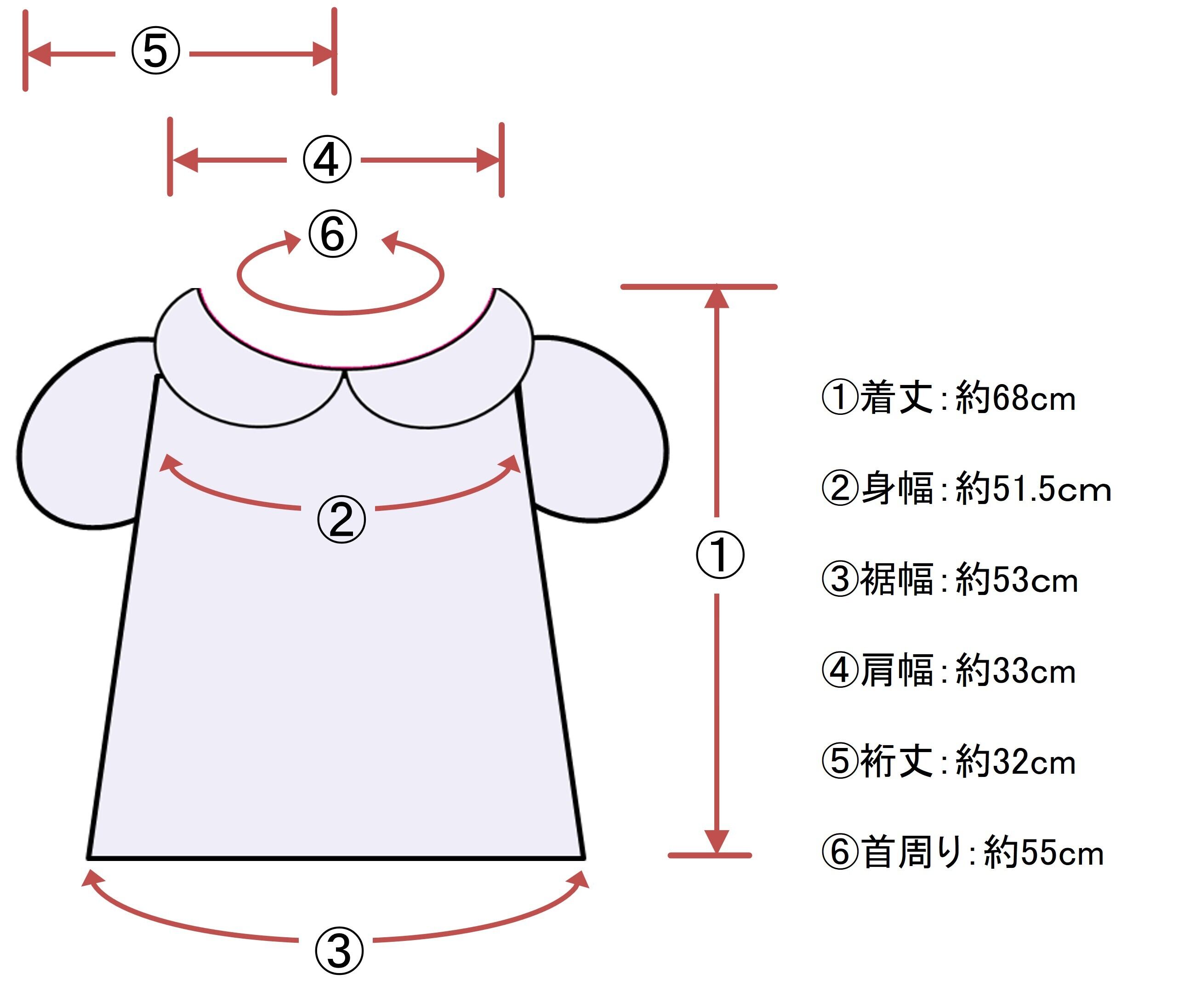 着丈:約68cm 身幅:約51.5cm 裾幅:約53cm 肩幅:約33cm 裄:約32cm 首周り:約55cm