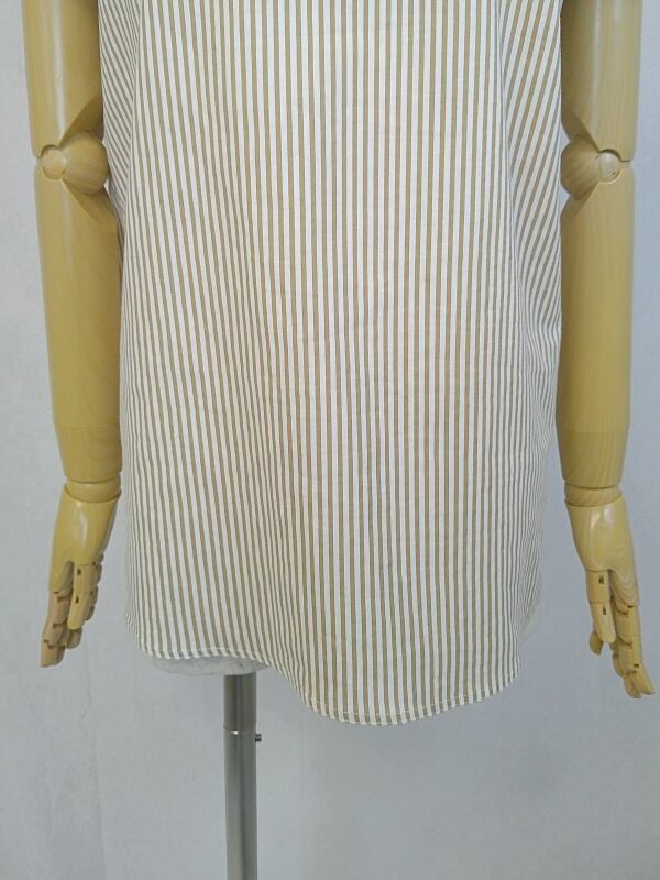 小さめのバルーン袖のデザインが、ベージュと白のすっきりとした柄の上品な雰囲気に、かわいらしさを演出しています。
