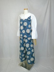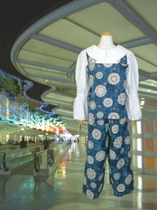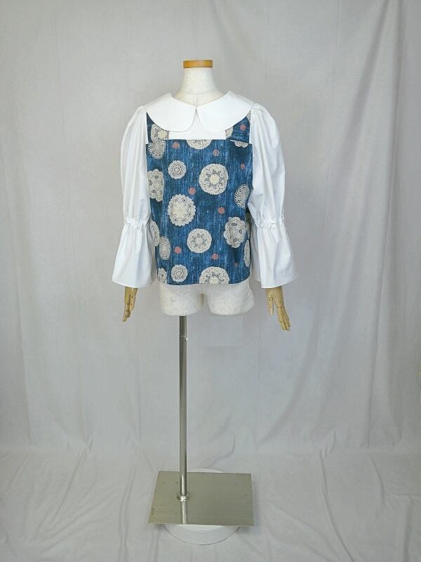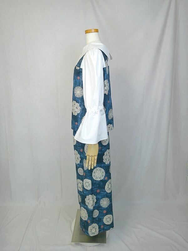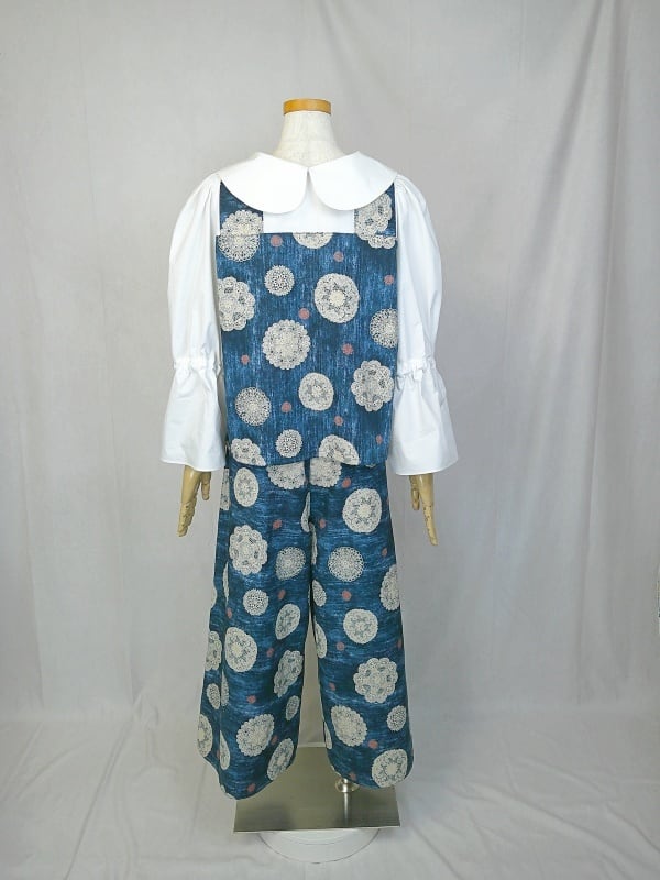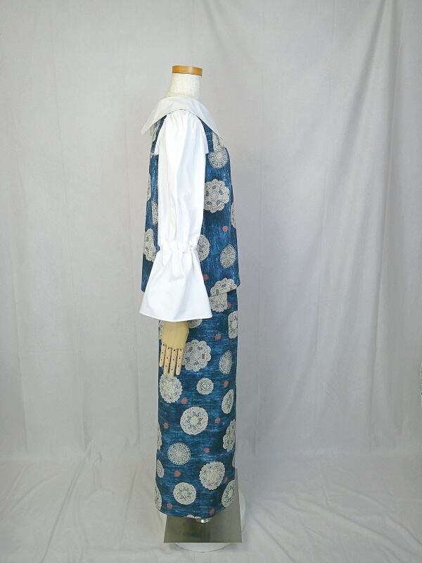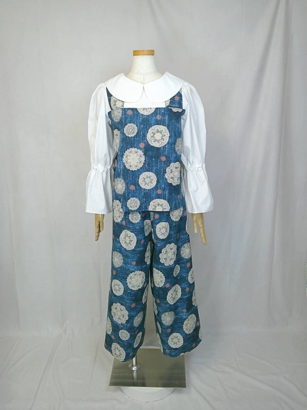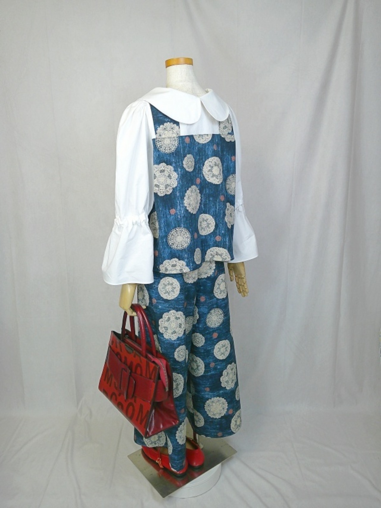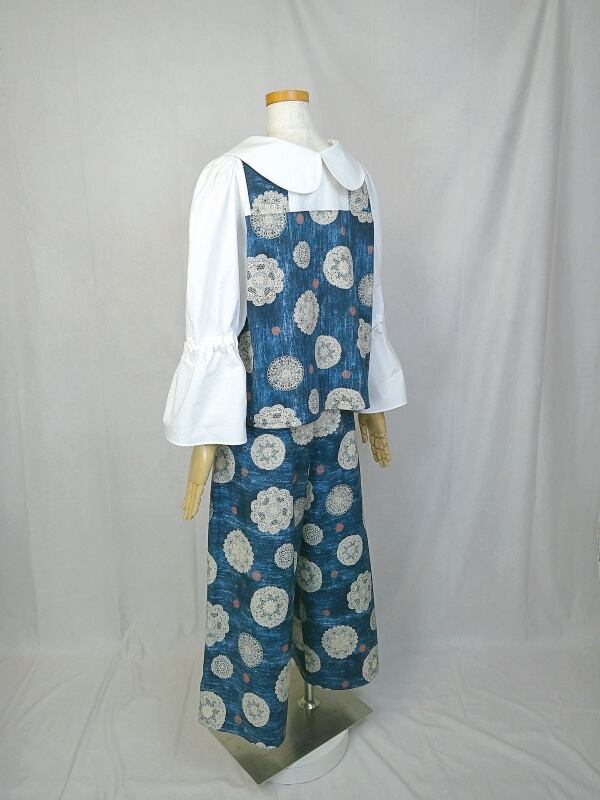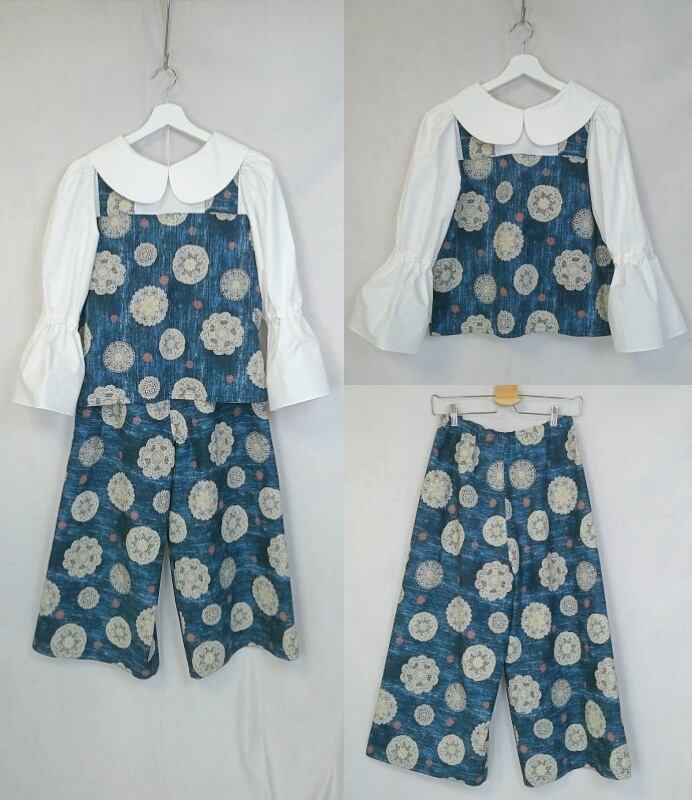 丸襟ツーピース 【BMS00000033】 ★タイト系ズボン&重ね着風ブラウスが、オシャレな雰囲気を演出する、デニム調素材に水玉レース柄がかわいい丸襟ツーピース★ 手作り 一点物 快適 通勤 通学 ビジネス 締め付けない 国産 日本製 ミモレ丈 ベルスリーブ コットン100%