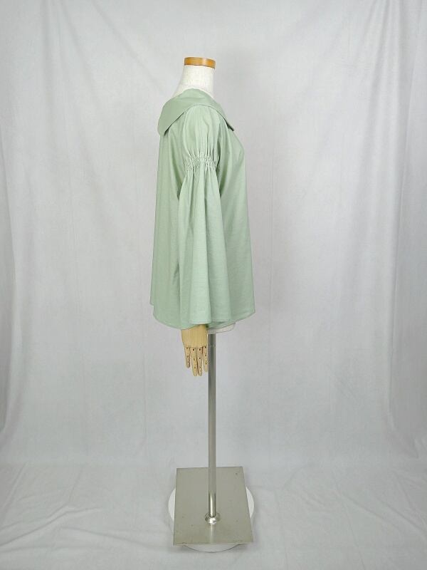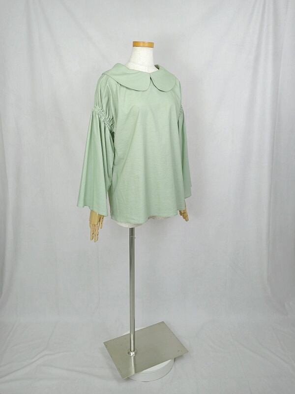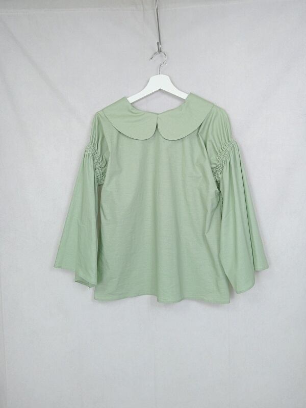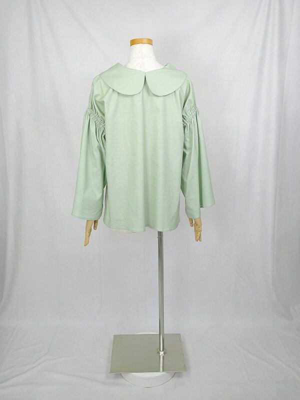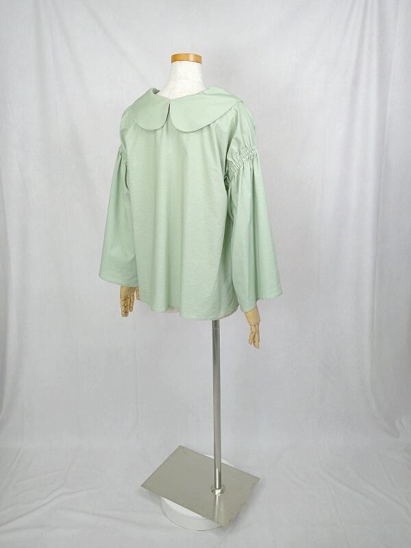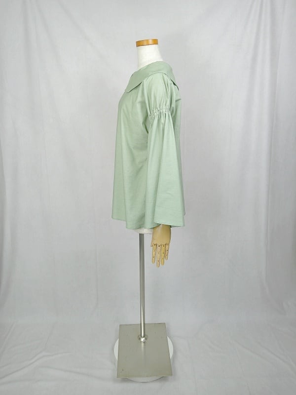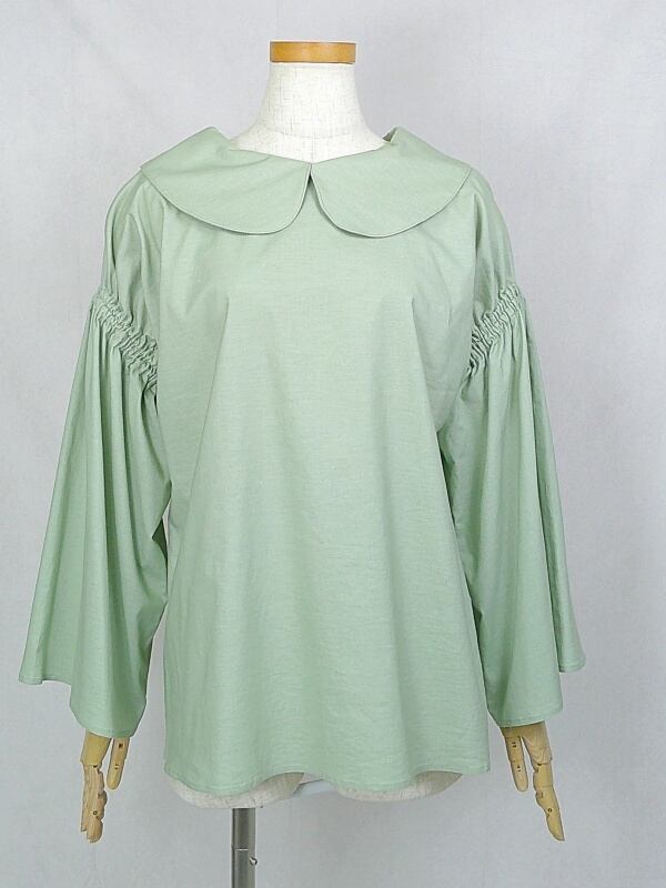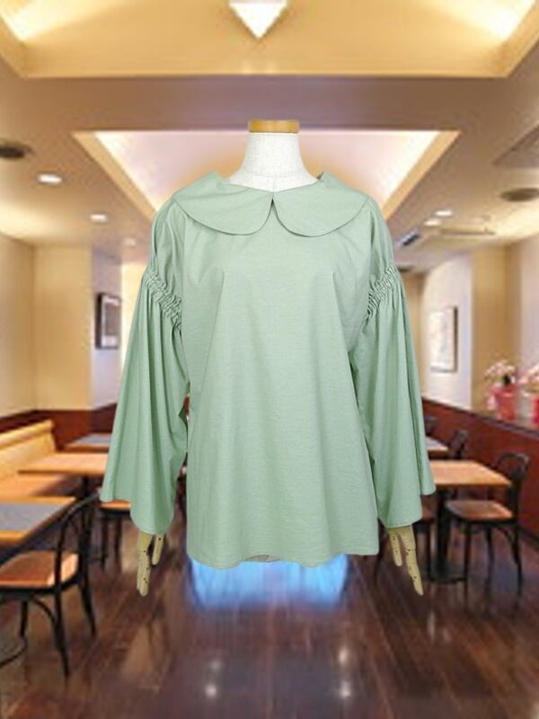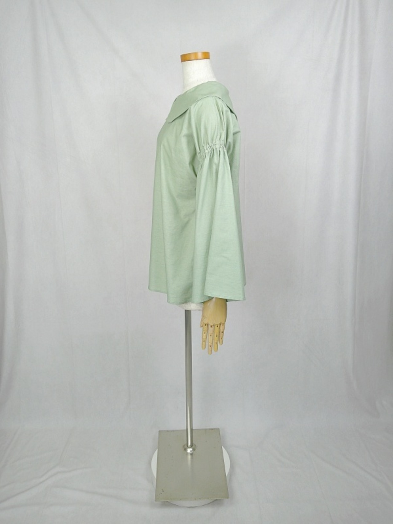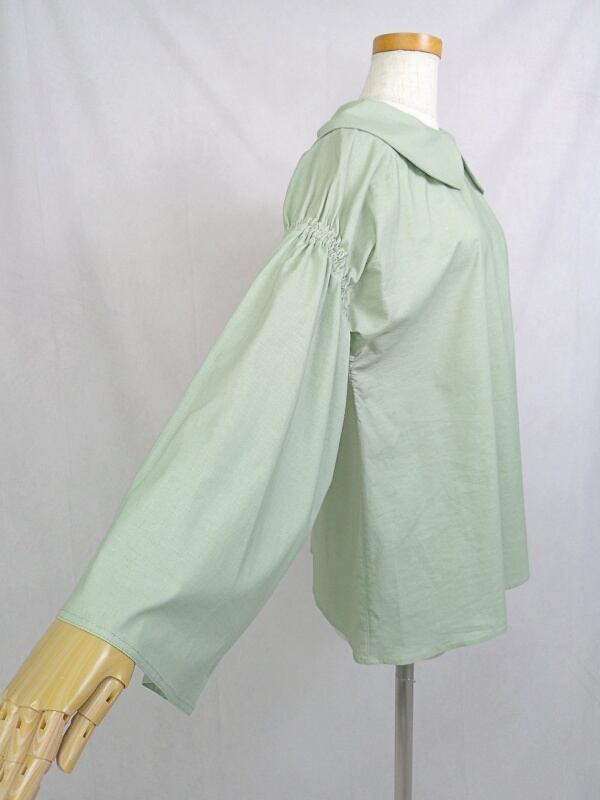 丸襟ブラウス 【TOP00000190】 ★ドロップショルダー&ケープスリーブがかわいらしい、上品なくすみグリーンの丸襟ブラウス★ 一点物 快適 通勤 通学 ビジネス 締め付けない 国産 日本製 コットン100% 長袖