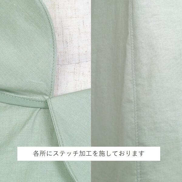 ドロップショルダーにケープスリーブを合わせたふんわりとしたシルエットは、かわいらしい雰囲気を見せ、くすみグリーンの先染め生地の落ち着いた色合いが、大人の上品さを演出しています。