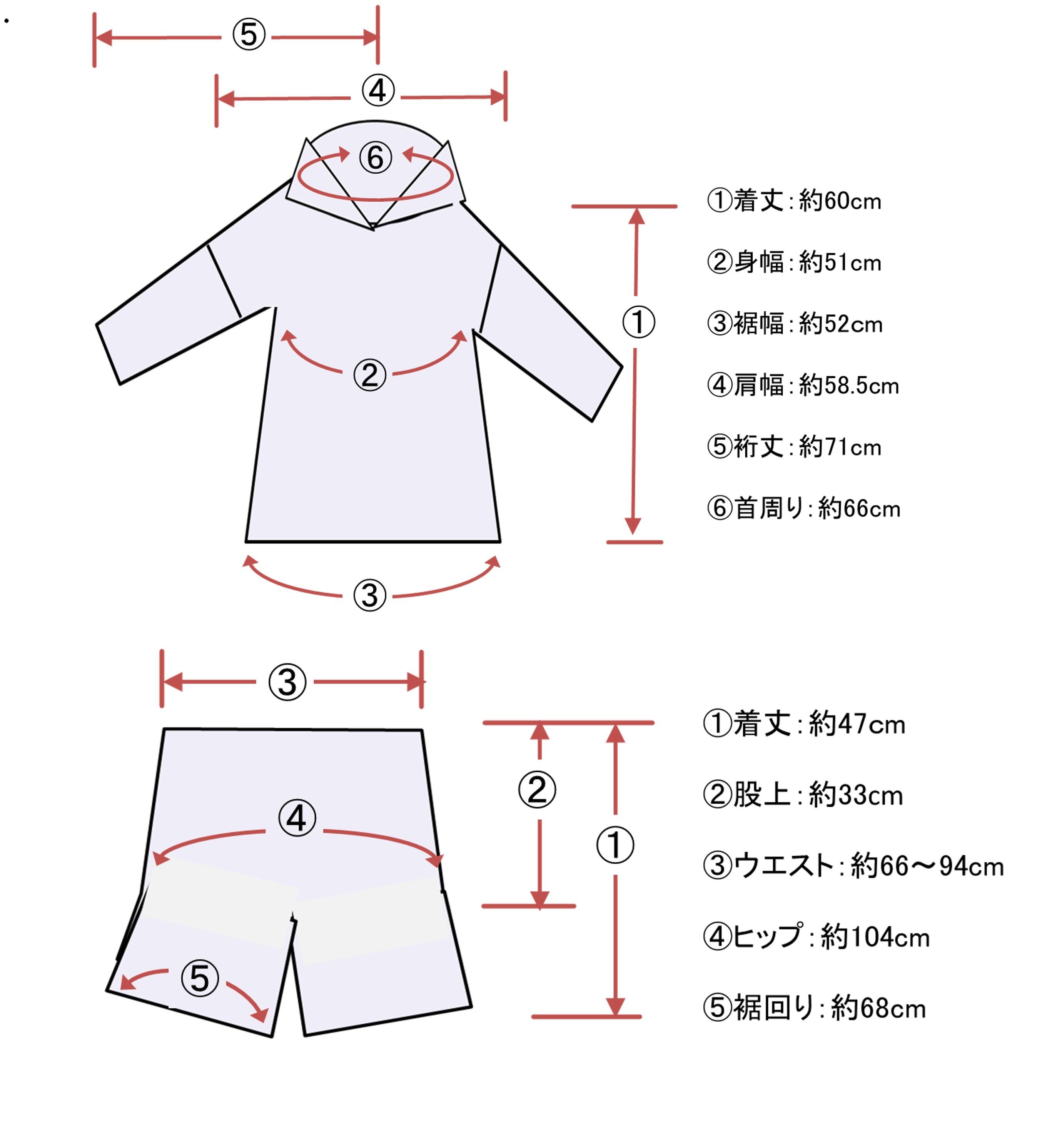 着丈:約60cm 身幅:約51cm 裾幅:約52cm 肩幅:約58.5cm 裄丈:約71cm 首周り:約66cm