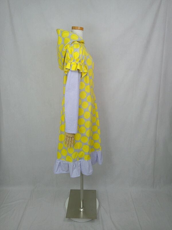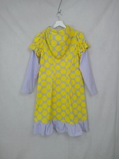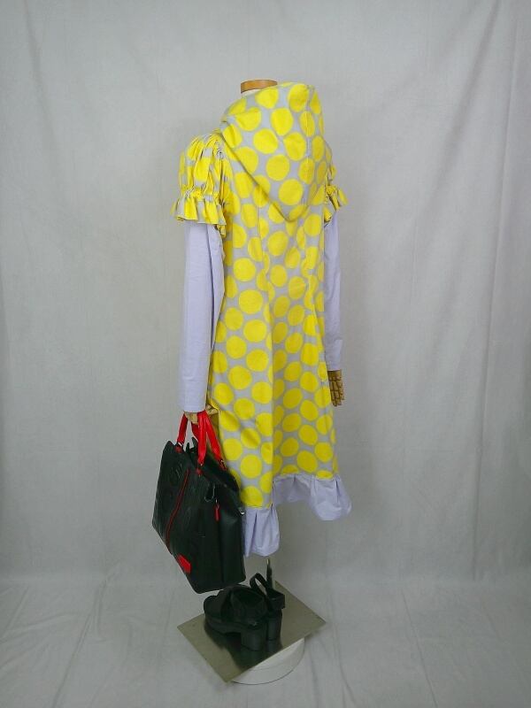 胸と背中にタックを入れた、きれいなシルエットのワンピースは、色々な表情を見せる大きなフードや、黄色の大きな水玉模様、絞りのない袖口のダブルスリーブ、裾に施した少し多きめなフリルなどが、大人のかわいらしさを演出しています。
