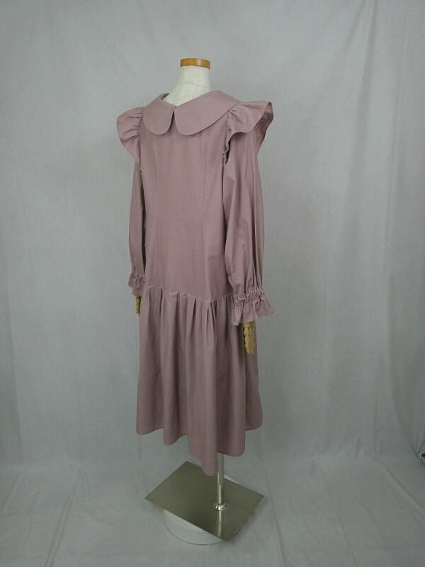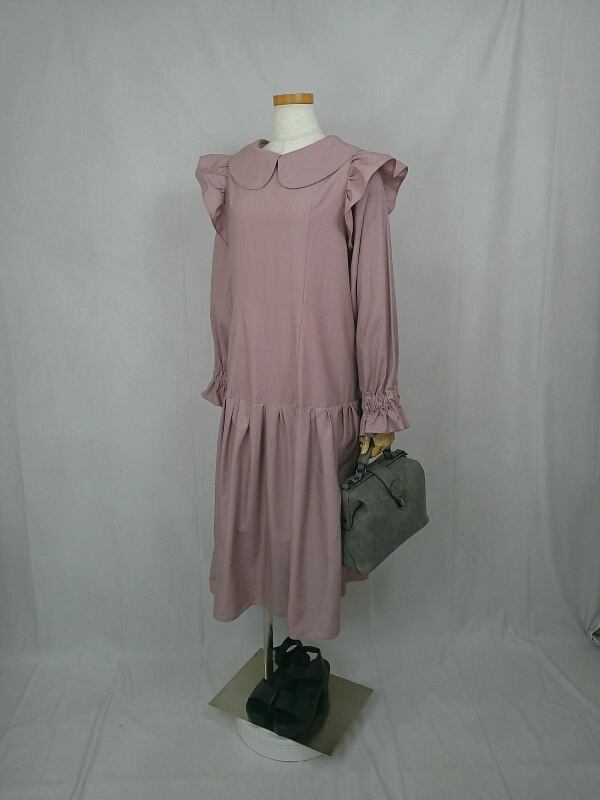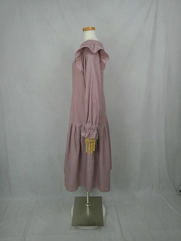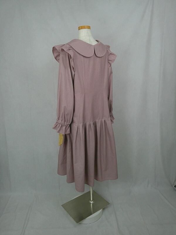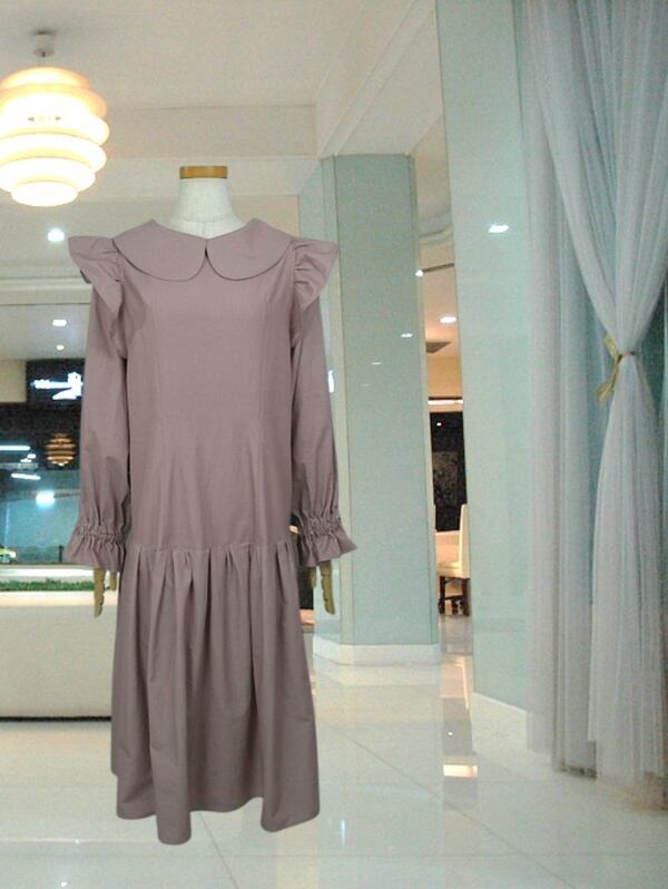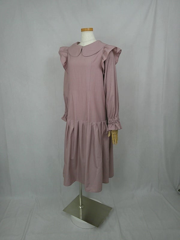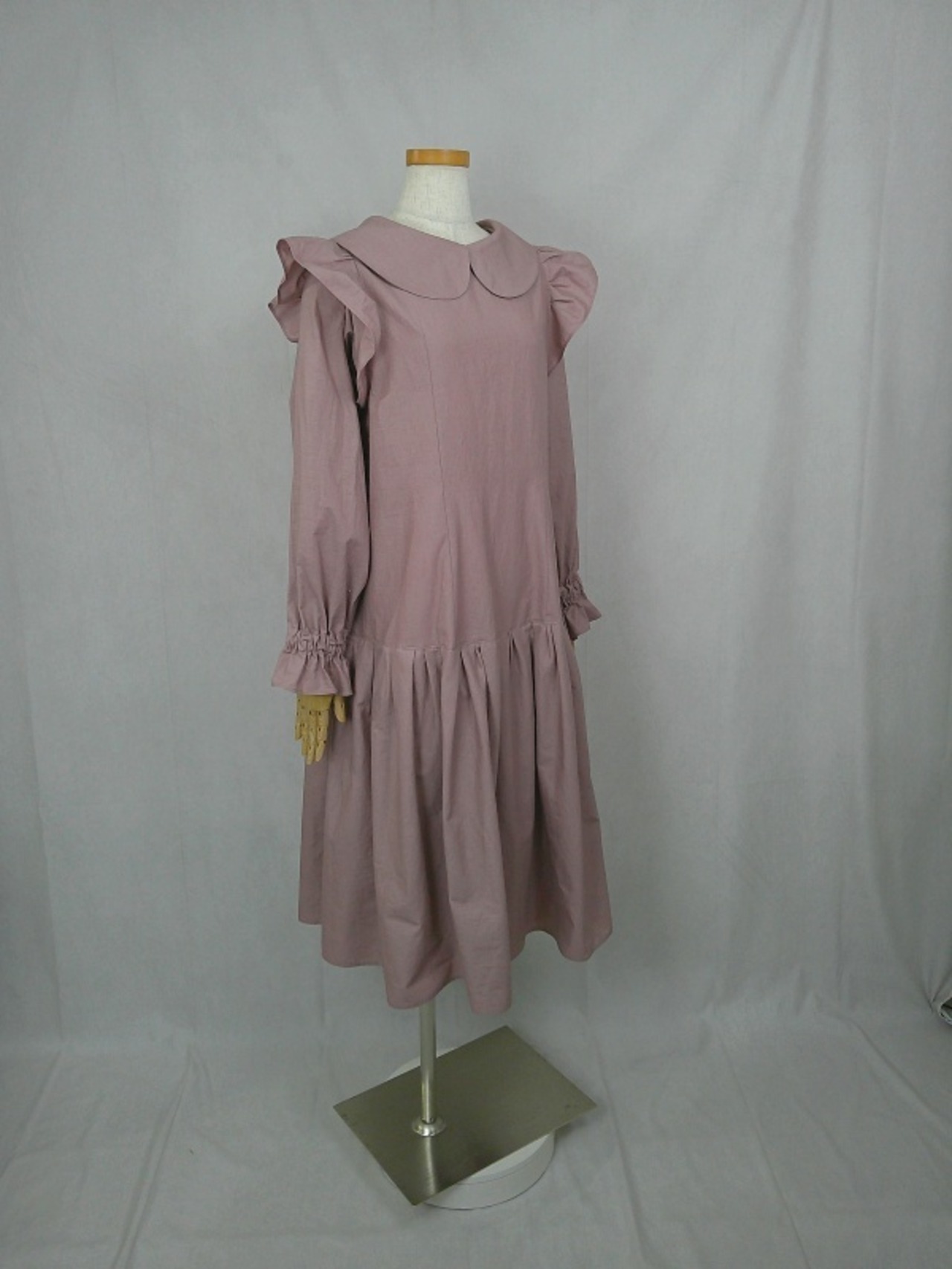 丸襟ワンピース 【pmi00000101】 ★肩のフリルやウエストに寄せたギャザーが、上品なかわいらしさを演出する、落ち着いたくすみラベンダーのミモレ丈丸襟ワンピース★ 手作り 一点物 快適 通勤 通学 ビジネス 締め付けない 国産 日本製 ミディ丈 オールシーズン コットン100%