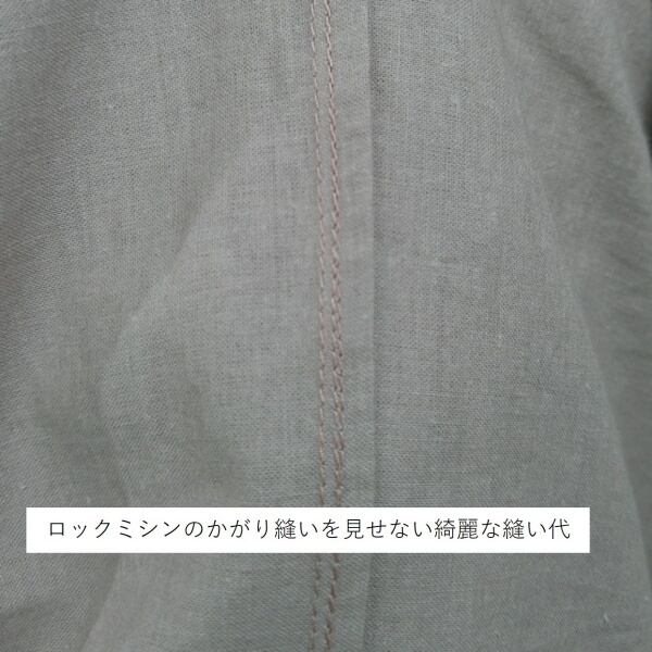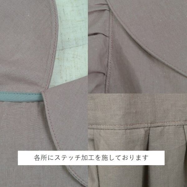 肩口に施したフリルや、ローウエストの位置からたっぷり寄せたギャザーのふんわり感がかわいらしい雰囲気を生み出し、先染め生地の風合いや、落ち着いたくすみラベンダーの色合いが、大人の上品さを演出しています。