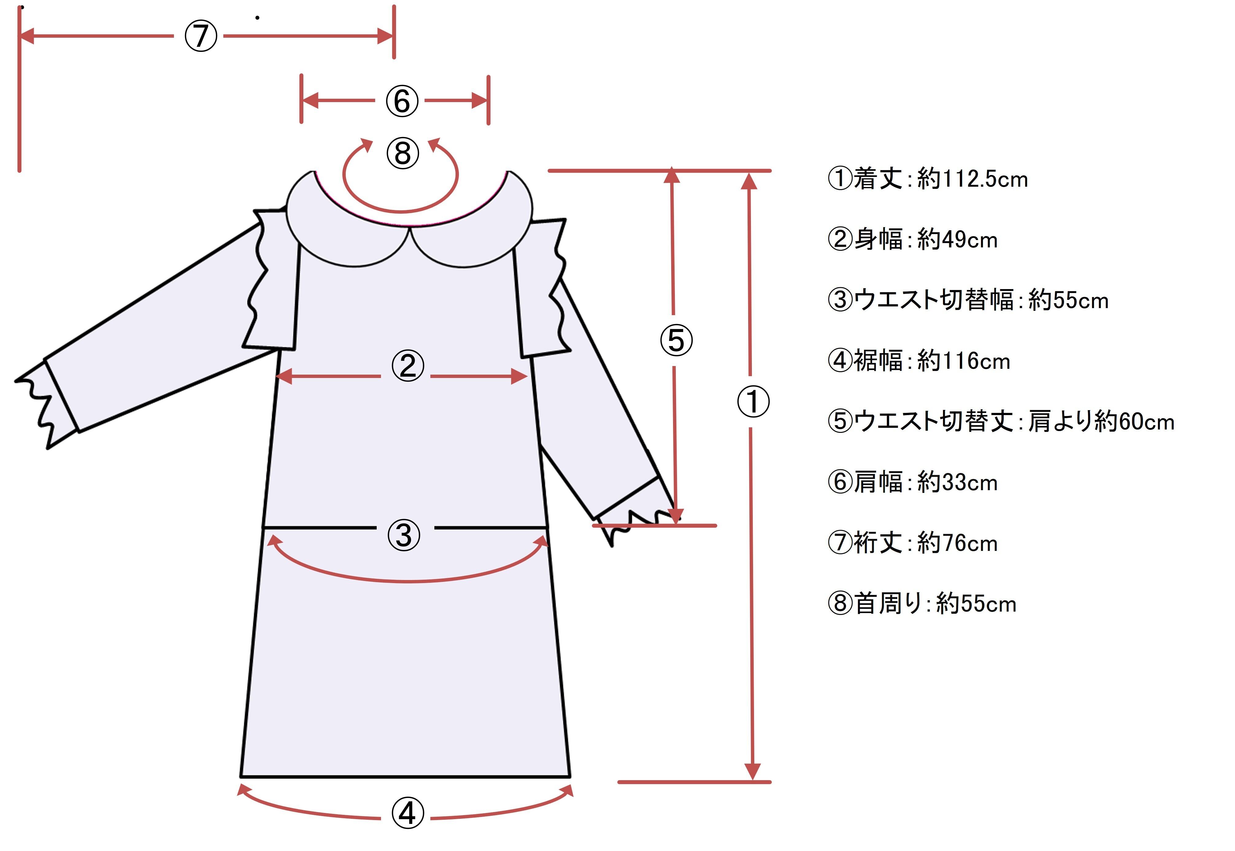 着丈:約112.5cm 身幅:約49cm 裾幅:約116cm 肩幅:約33cm 裄:約76cm ウエスト切替:肩から約66cm ウエスト切替幅:約55cm 首周り:約55cm