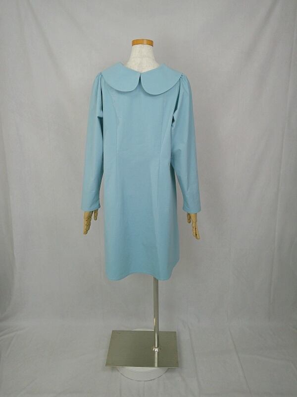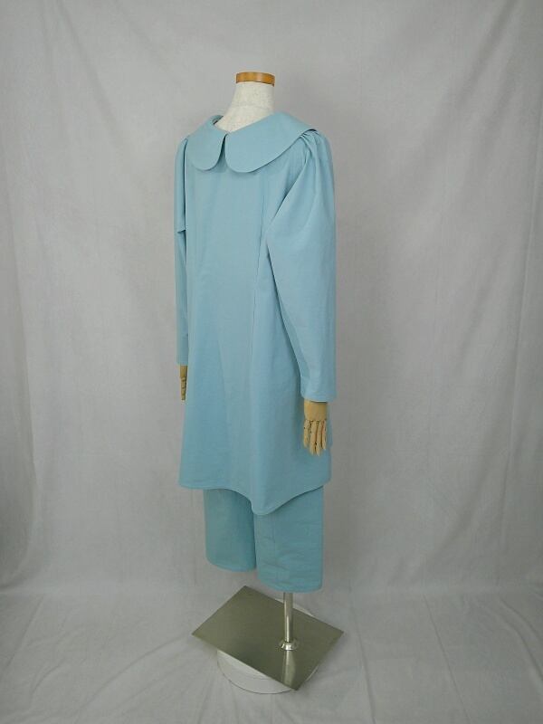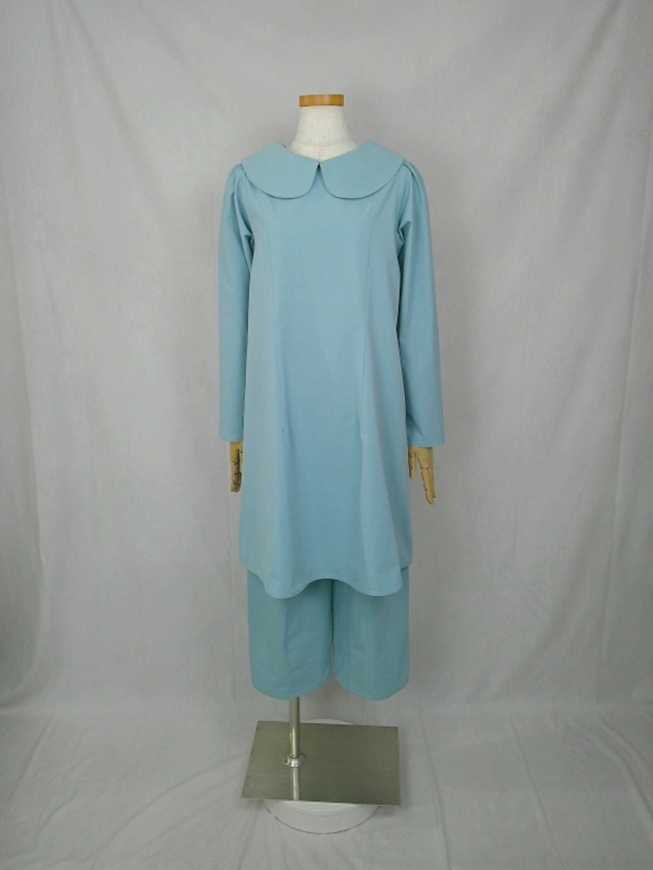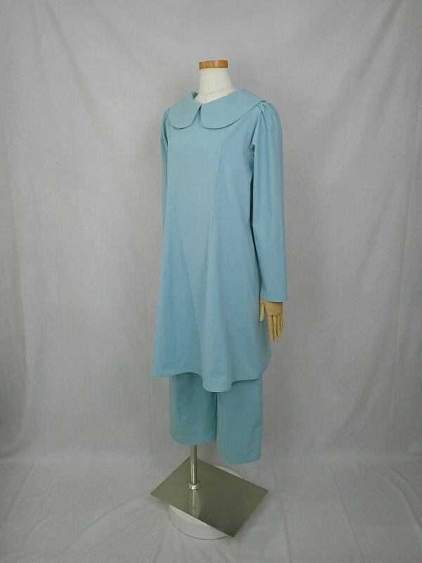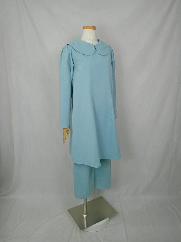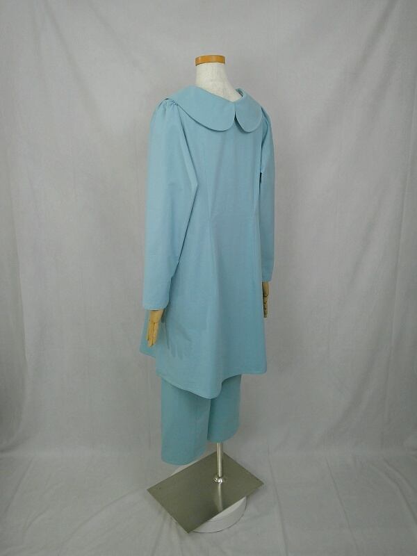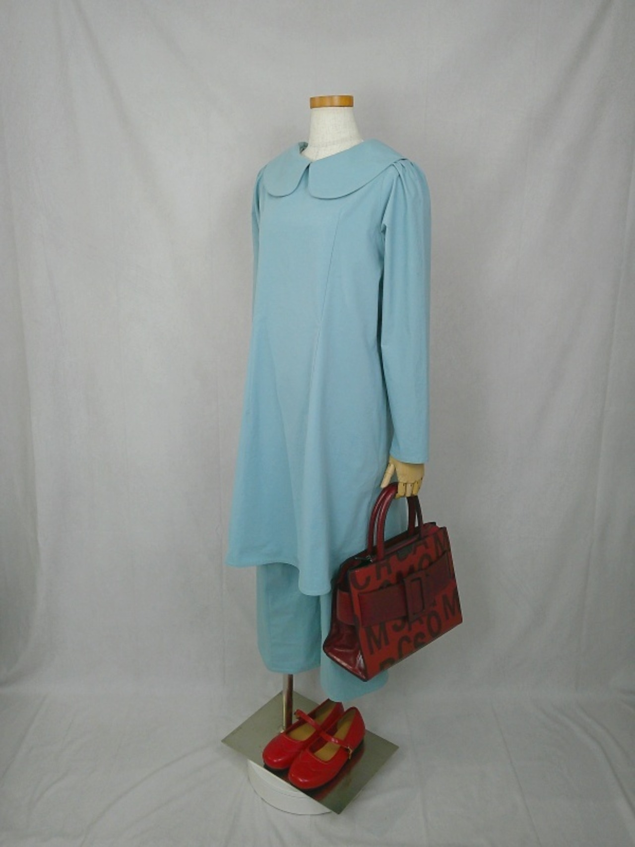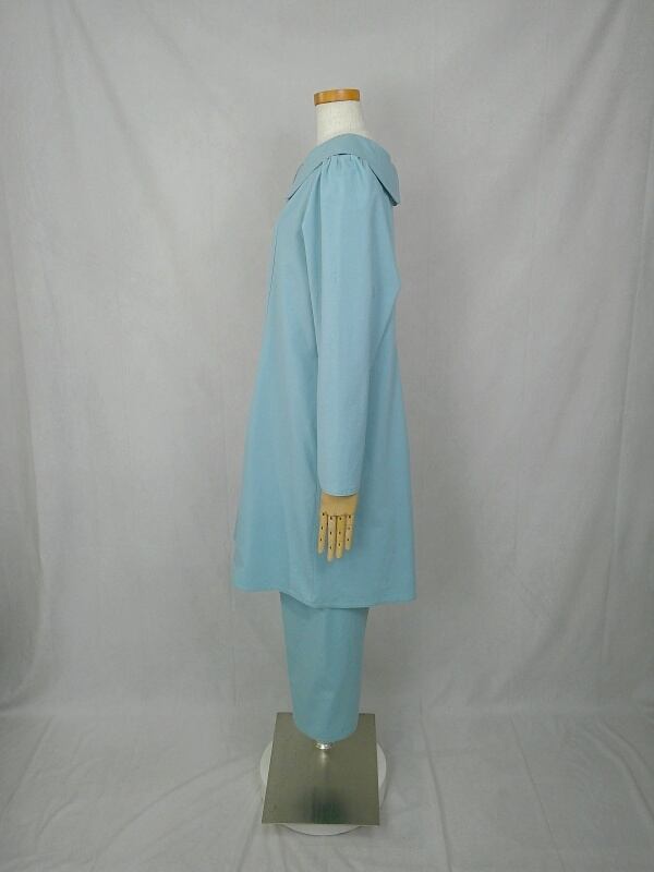丸襟ツーピース 【BMS00000034】 ★プリンセスラインワンピースとタイト系パンツの組合わせが上品に魅せる、綺麗なライトブルーの丸襟セットアップ★ 手作り 一点物 快適 通勤 通学 ビジネス 締め付けない 国産 日本製 ミモレ丈 コットン100%