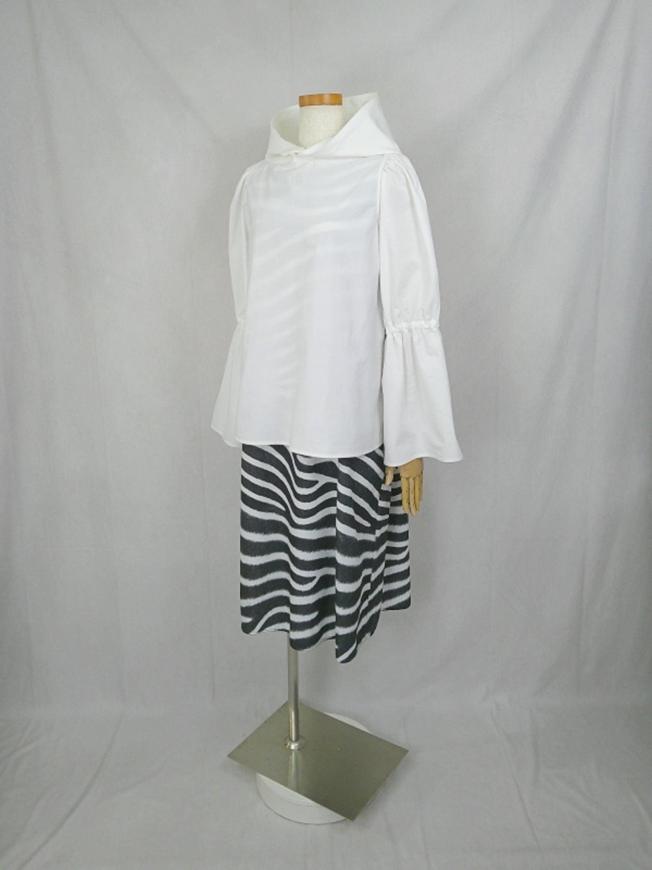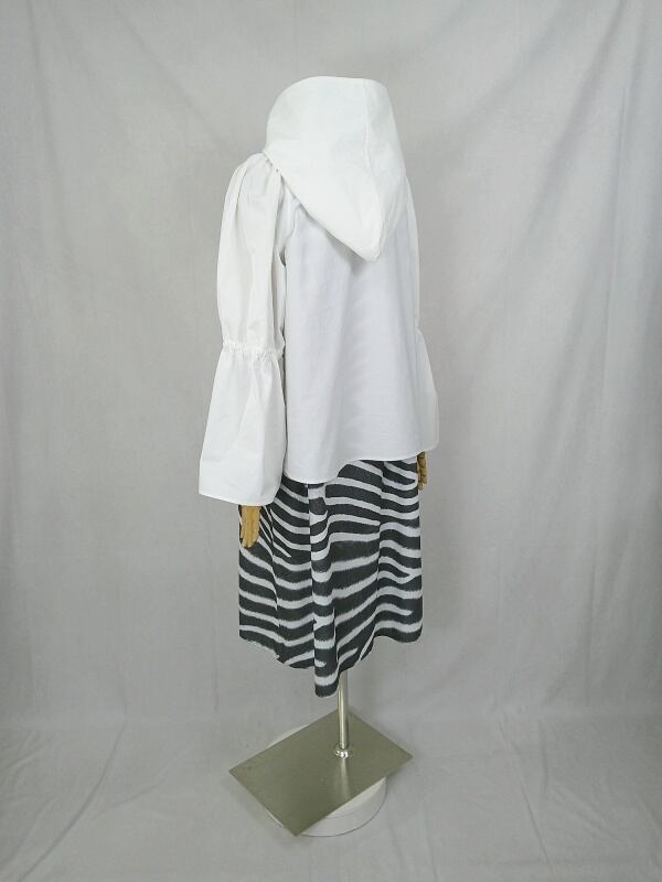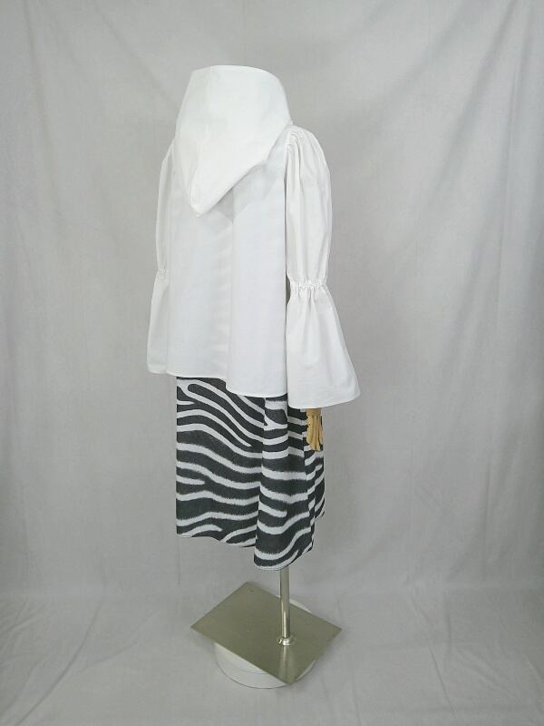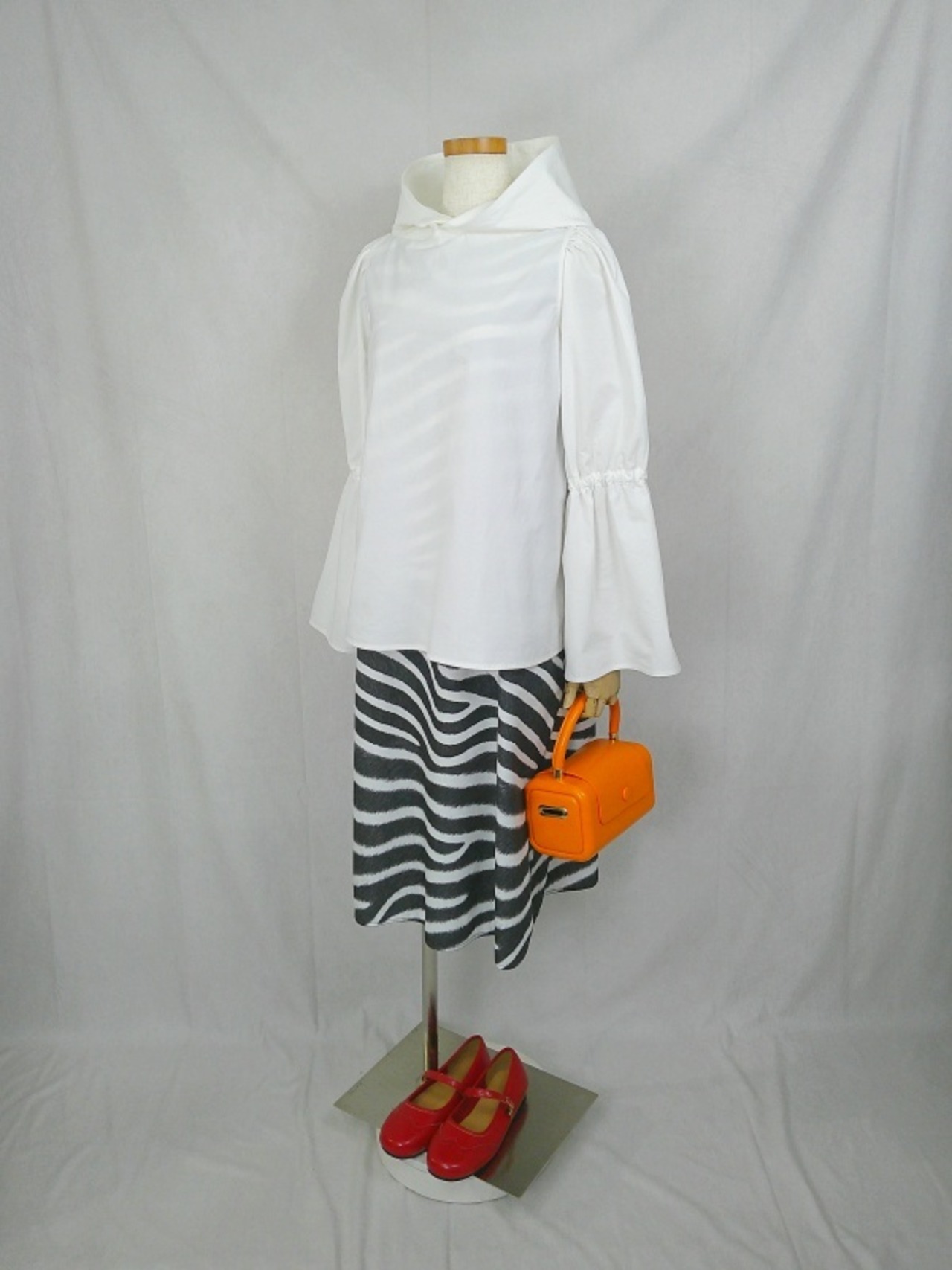 白色のすっきりとしたフードブラウスは、ひじの切り替え部分に施した少し大きめのベルスリーブのふんわり感が、大きめフードとともにかわいらしさを生み出し、控えめに広がるゼブラ柄のミディ丈インナーワンピースとの組み合わせにより、高級感のある雰囲気を演出しています。