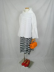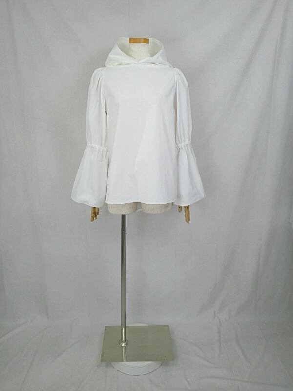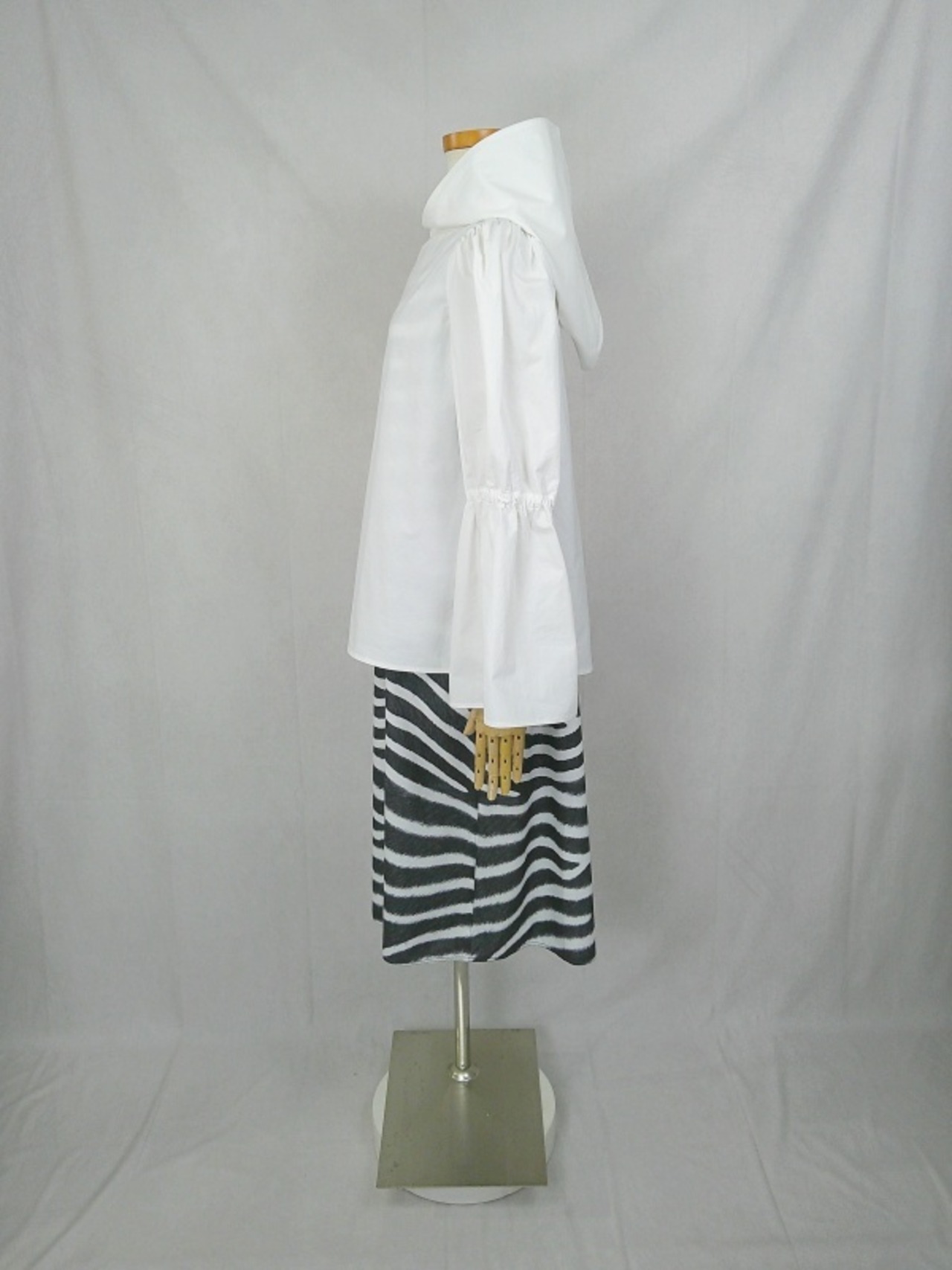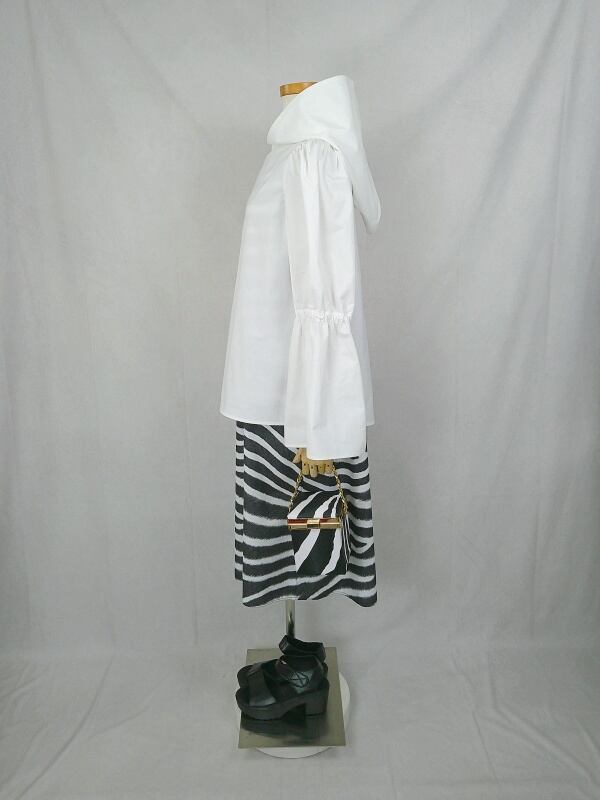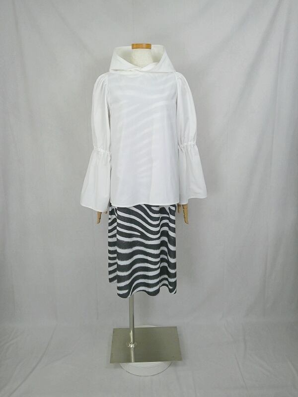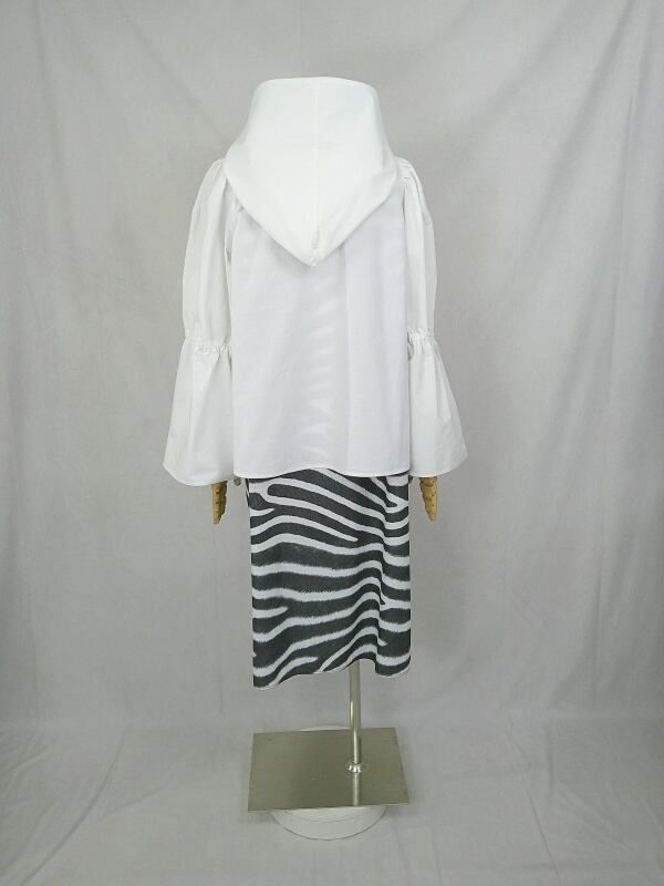 白色のすっきりとしたフードブラウスは、ひじの切り替え部分に施した少し大きめのベルスリーブのふんわり感が、大きめフードとともにかわいらしさを生み出し、控えめに広がるゼブラ柄のミディ丈インナーワンピースとの組み合わせにより、高級感のある雰囲気を演出しています。