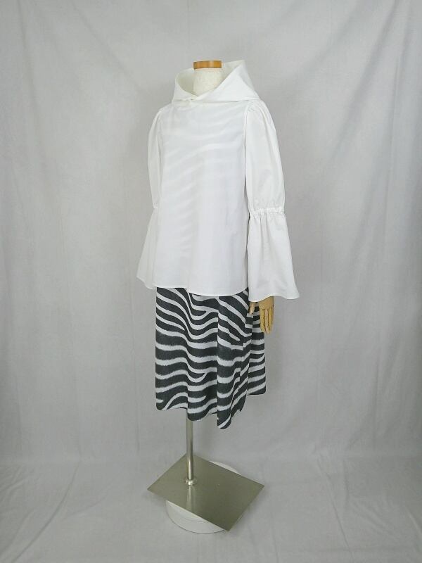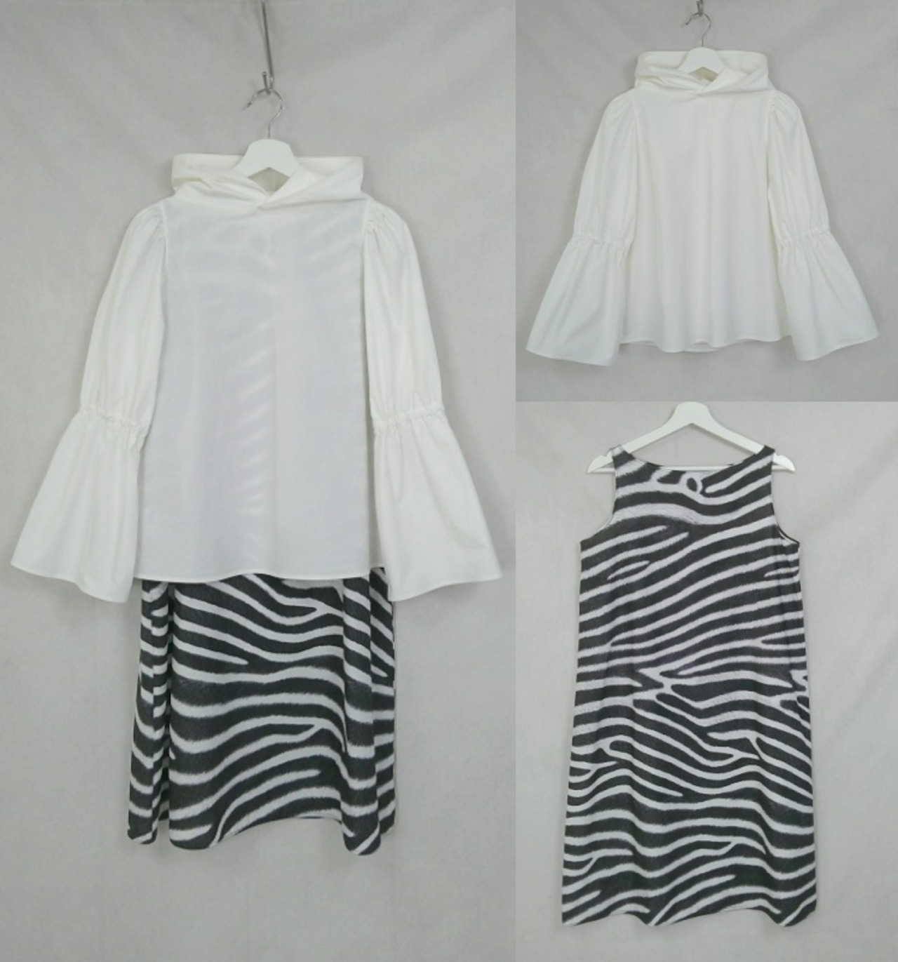 フードワンピース 【hdd00000051】★ふんわりベルスリーブのブラウスと、エレガントなゼブラ柄のインナーワンピースの組み合わせが絶妙な、高級感のあるフードスタイルのセットアップ★ 手作り 一点物 快適 通勤 通学 ビジネス 締め付けない 国産 日本製 コットン100% パーカー