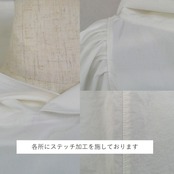 当社の製品は、ボタンやファスナー、金具等を一切使用せず、袖口のゴムやウエストリボンなどを取り入れ、メリハリのある形を表現しております。