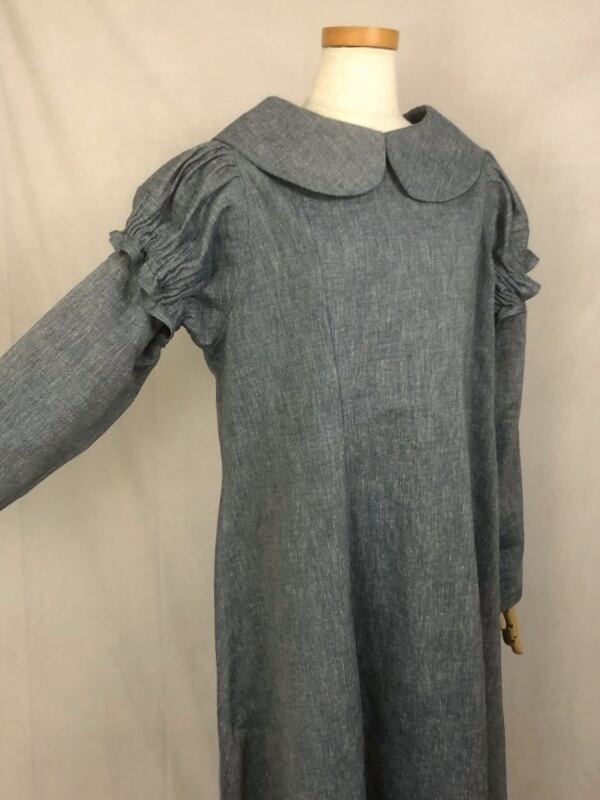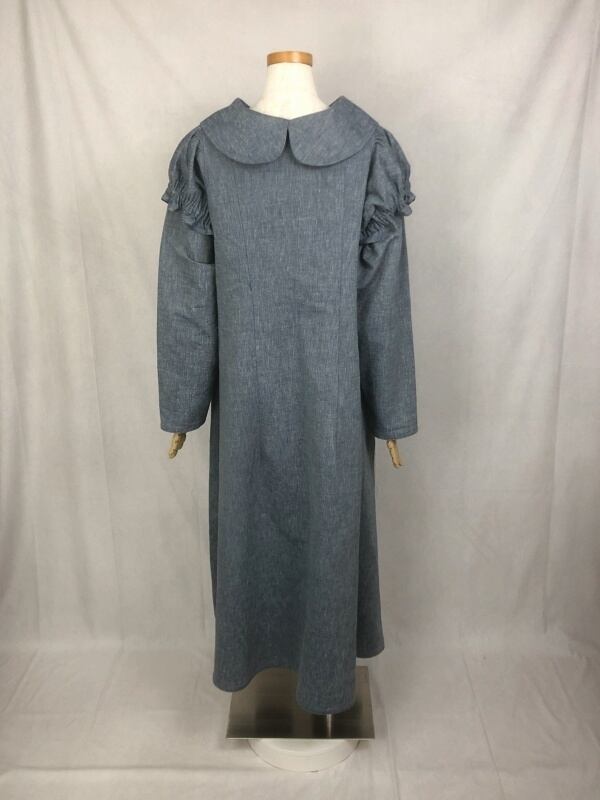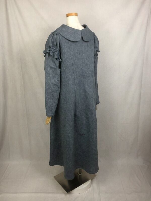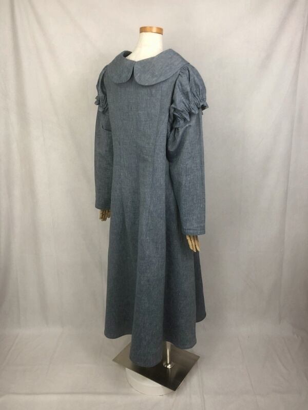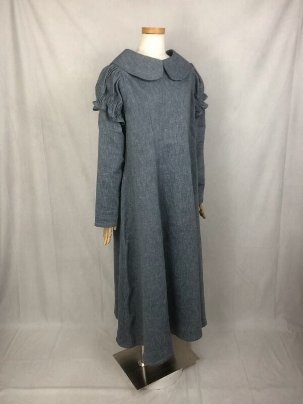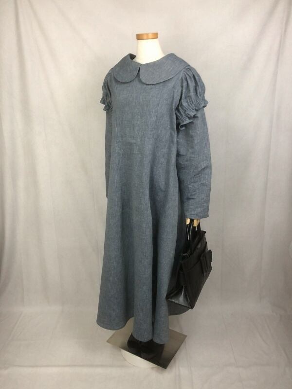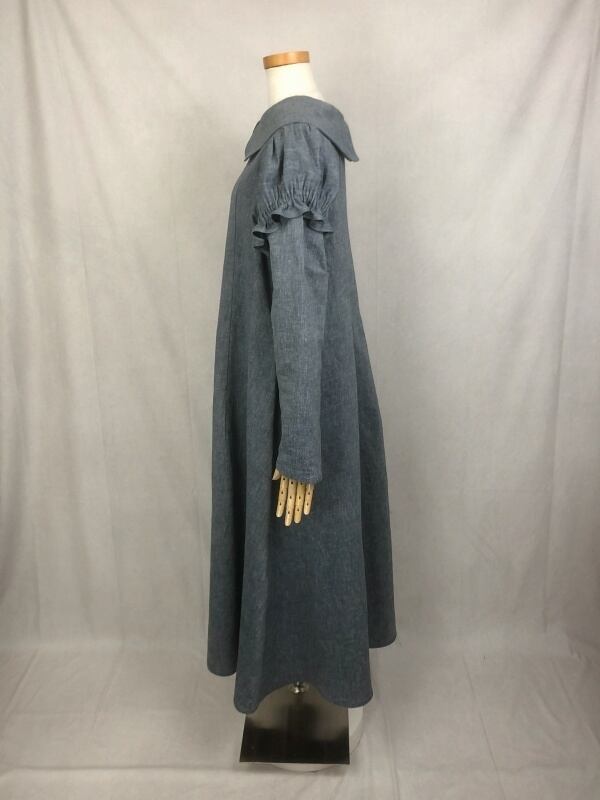 丸襟ワンピース 【pmi00000102】 ★デニムの落ち着いた素材に、袖のフリルやプリンセスラインがかわいらしさを演出する、ネイビー系のマキシ丈丸襟ワンピース★ 一点物 快適 通勤 通学 ビジネス★ 手作り 一点物 快適 通勤 通学 ビジネス 締め付けない 国産 日本製 マキシ丈 オールシーズン コットン100%