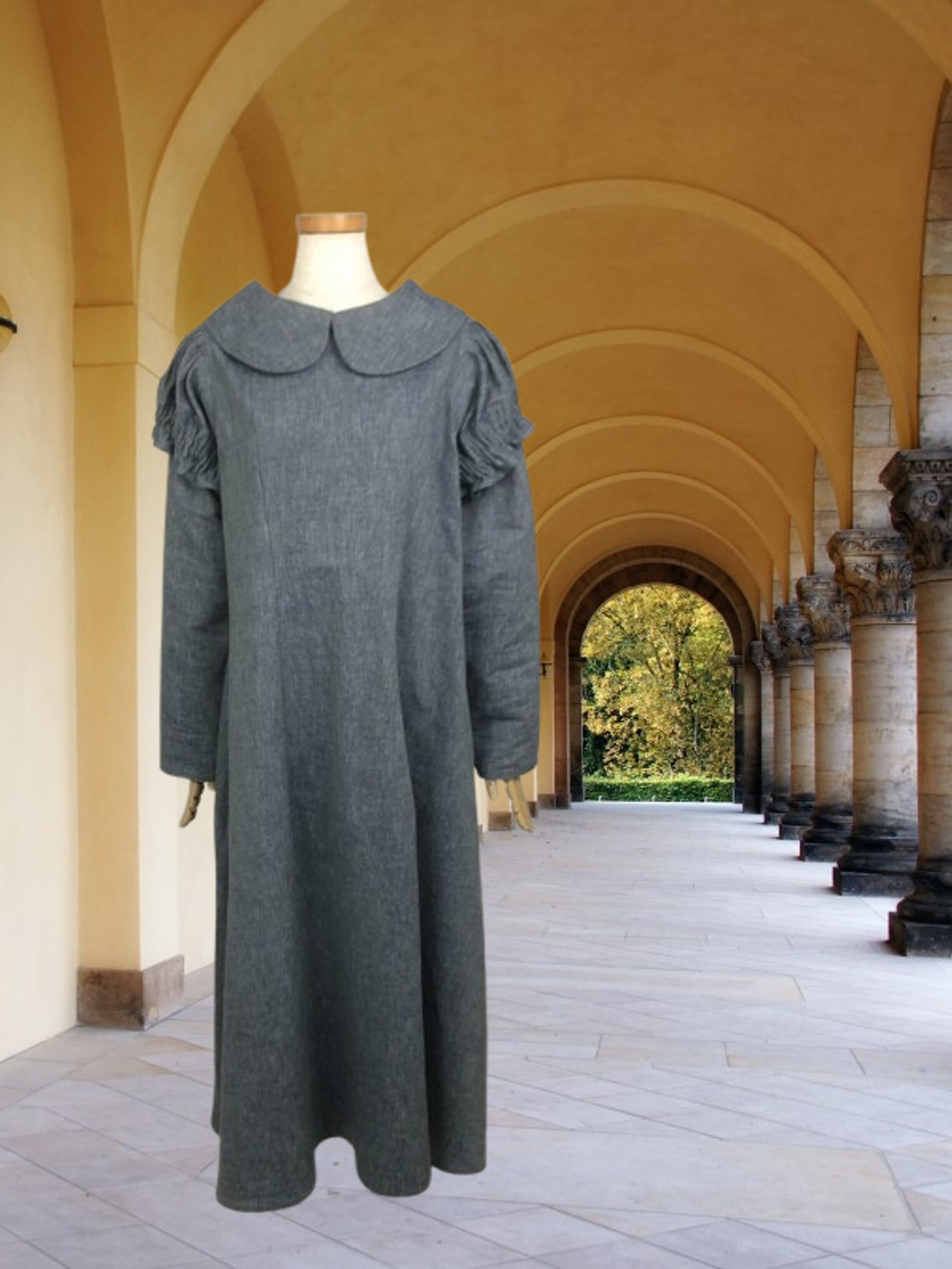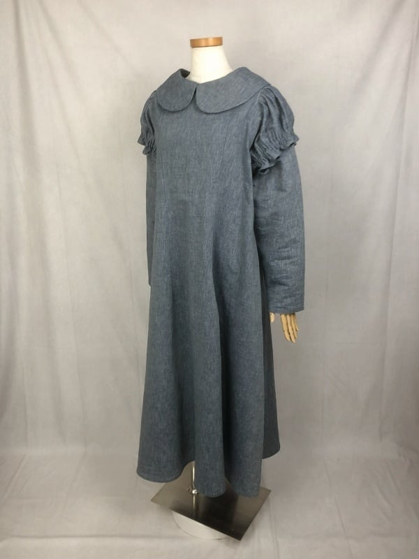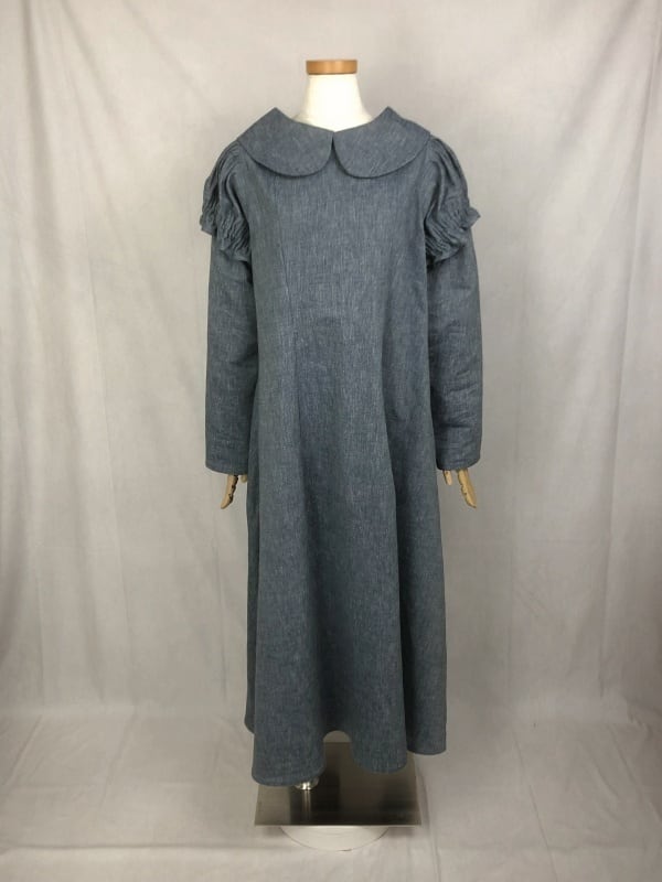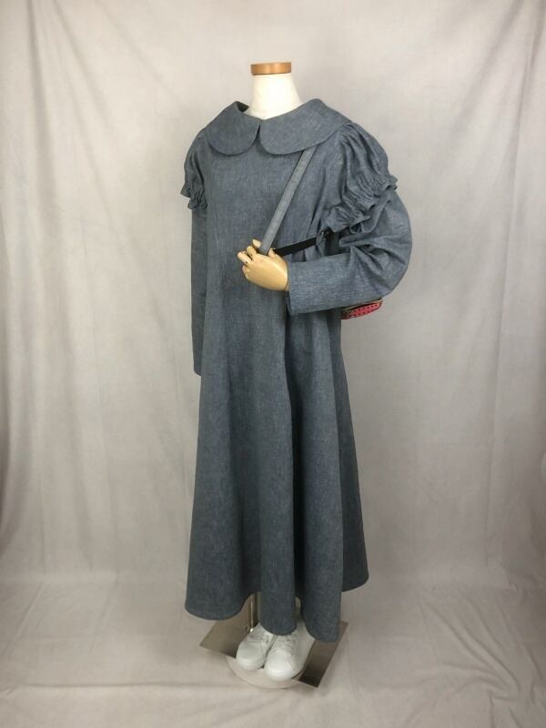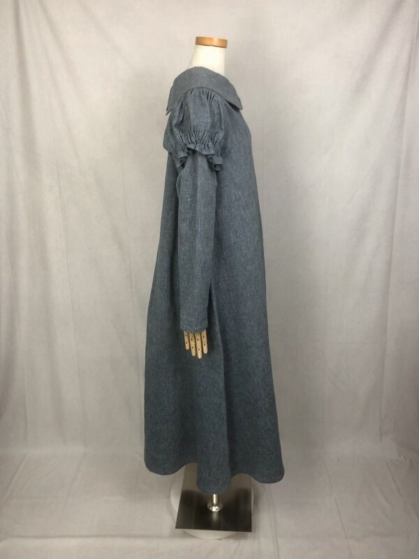 丸襟ワンピース 【pmi00000102】 ★デニムの落ち着いた素材に、袖のフリルやプリンセスラインがかわいらしさを演出する、ネイビー系のマキシ丈丸襟ワンピース★ 一点物 快適 通勤 通学 ビジネス★ 手作り 一点物 快適 通勤 通学 ビジネス 締め付けない 国産 日本製 マキシ丈 オールシーズン コットン100%