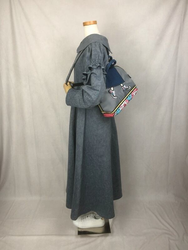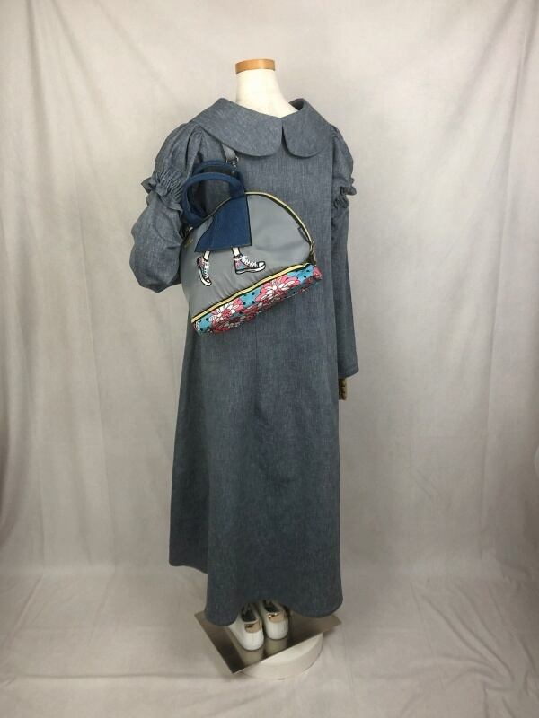 肩口に上腕の切替部分にフリルを施したダブルスリーブや、胸のプリンセスラインによって生まれるキレイなシルエットは、落ち着いたネイビーのデニム素材を使用し、マキシ丈に仕上げた上品なワンピースに、大人のかわいらしさを演出しています。
