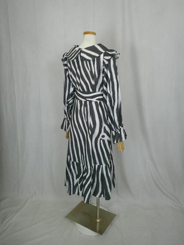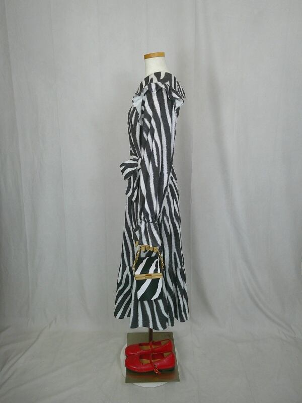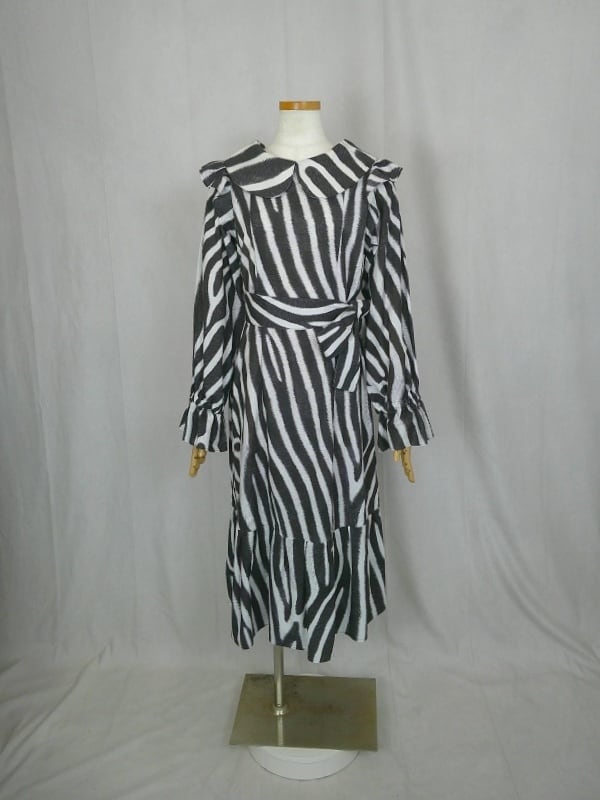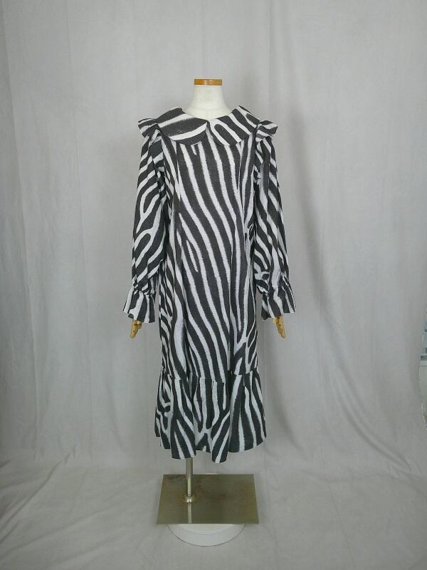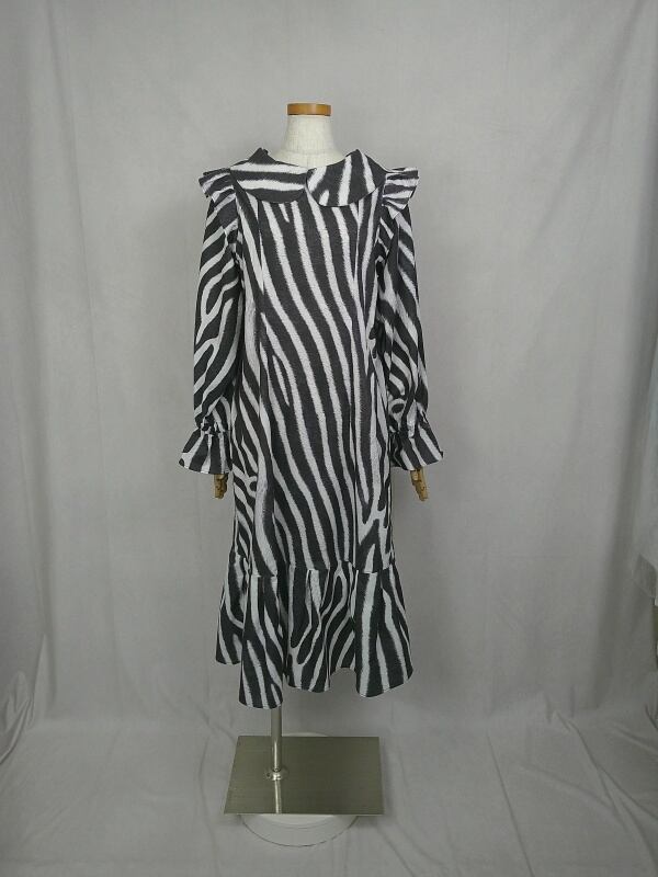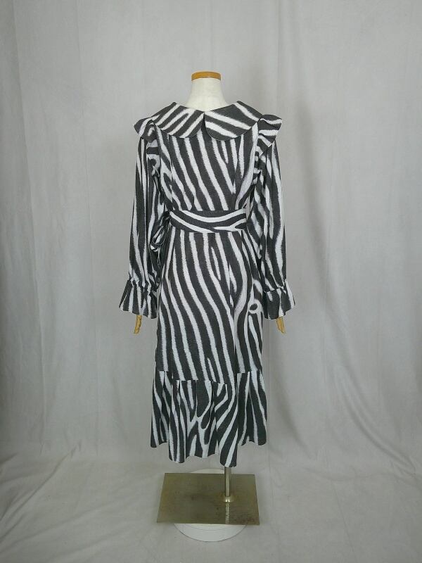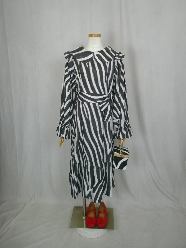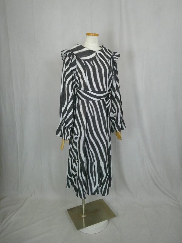 丸襟ワンピース 【pmi00000103】 ★肩と裾のフリルがかわいらしさをプラスする、高級感あるゼブラ柄&プリンセスラインのエレガントなミディ丈丸襟ワンピース★ 一点物 快適 通勤 通学 ビジネス★ 手作り 一点物 快適 通勤 通学 ビジネス 締め付けない 国産 日本製 ミモレ丈 オールシーズン コットン100%