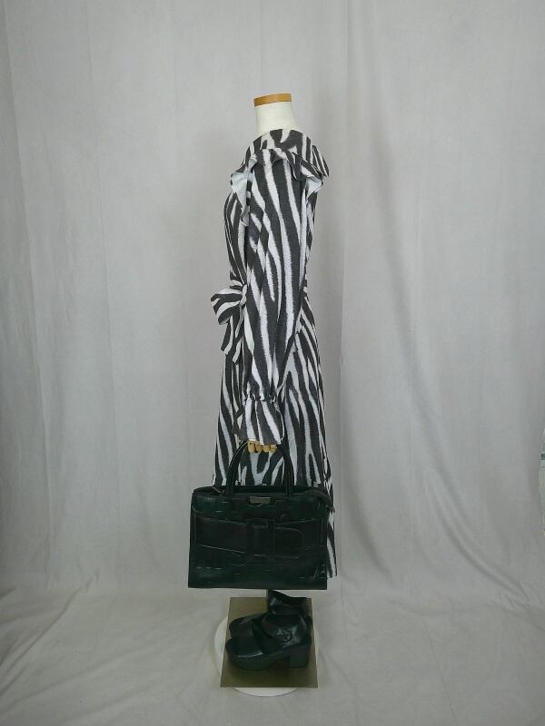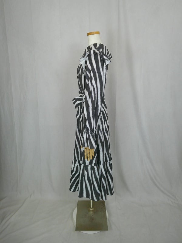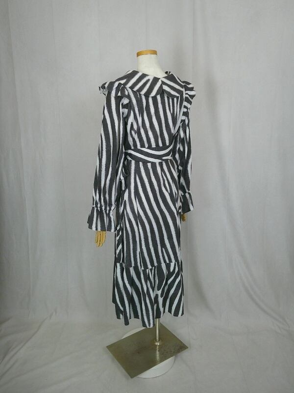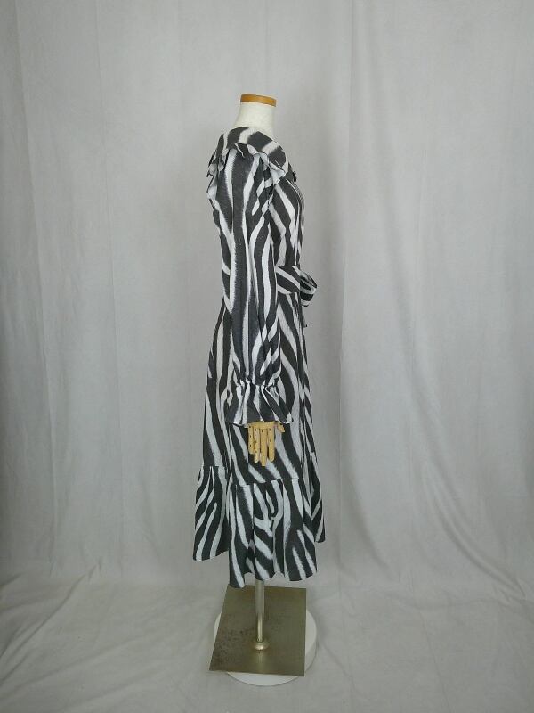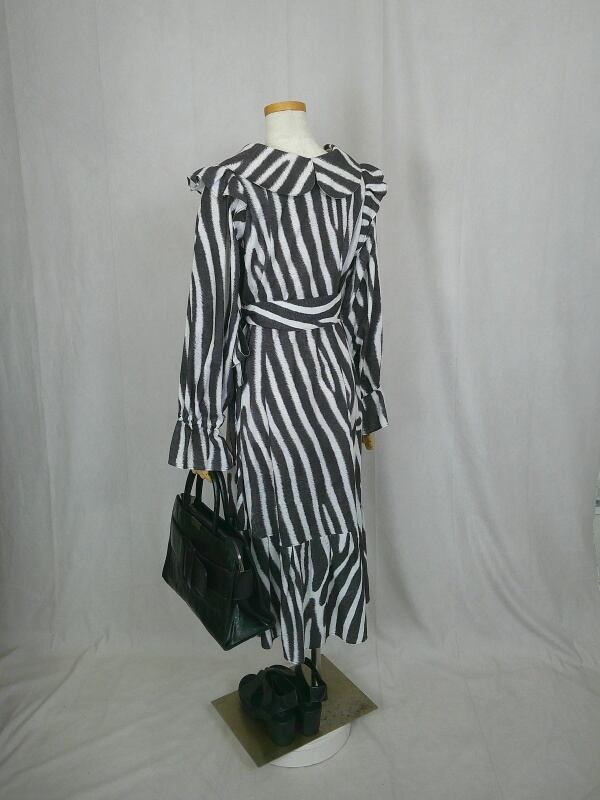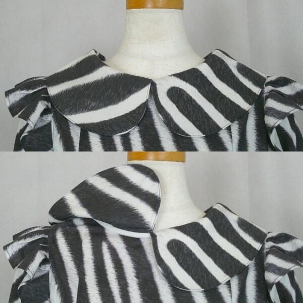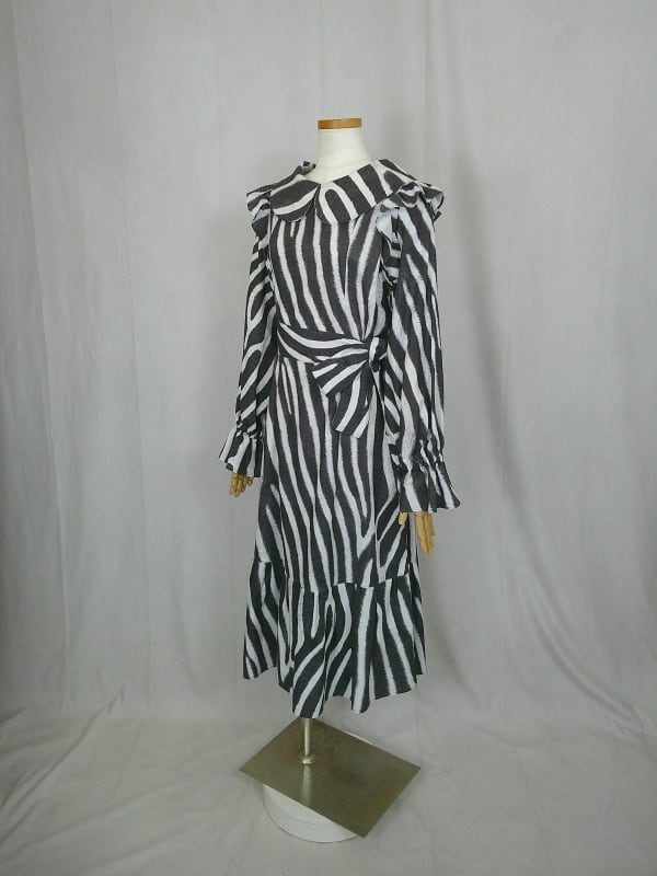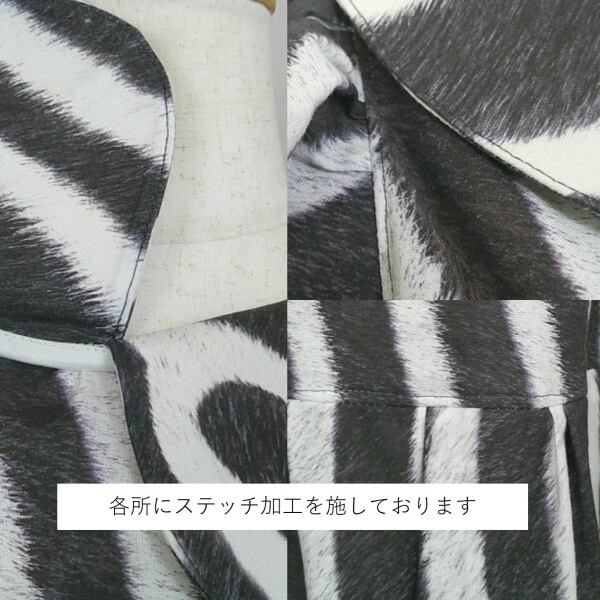 丸襟ワンピース 【pmi00000103】 ★肩と裾のフリルがかわいらしさをプラスする、高級感あるゼブラ柄&プリンセスラインのエレガントなミディ丈丸襟ワンピース★ 一点物 快適 通勤 通学 ビジネス★ 手作り 一点物 快適 通勤 通学 ビジネス 締め付けない 国産 日本製 ミモレ丈 オールシーズン コットン100%