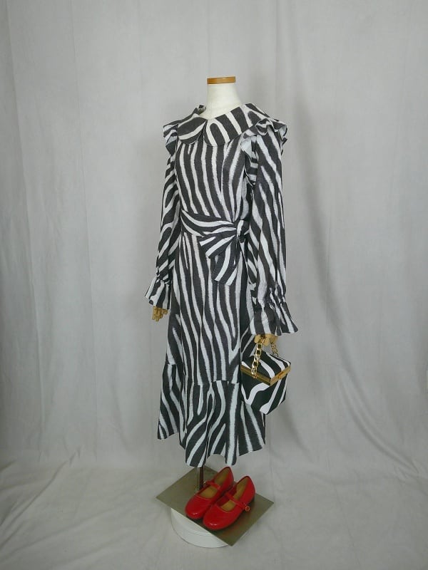 肩に施したフリルや、大きめの裾フリルのふんわり感が、胸のプリンセスラインによって生まれるキレイなシルエットや、ゼブラ柄の高級感のあるエレガントな雰囲気に、大人のかわいらしさを演出しています。