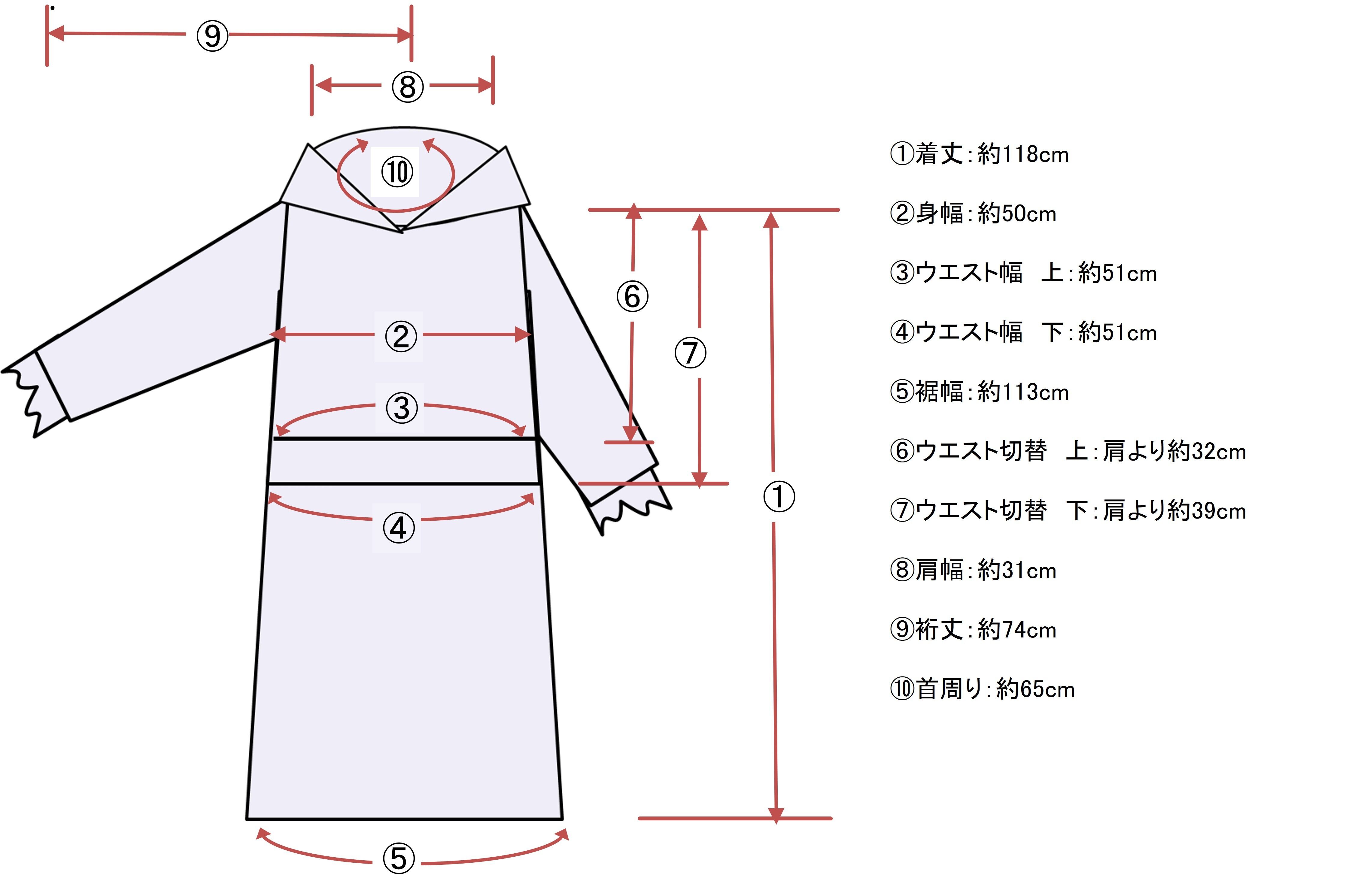 着丈:約112cm 身幅:約50cm 裾幅:約113cm 肩幅:約31cm 裄丈:約74cm ウエスト切替:肩から約32㎝ ウエスト幅:約51㎝ 首周り:約65cm