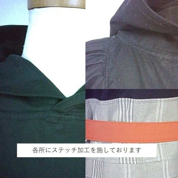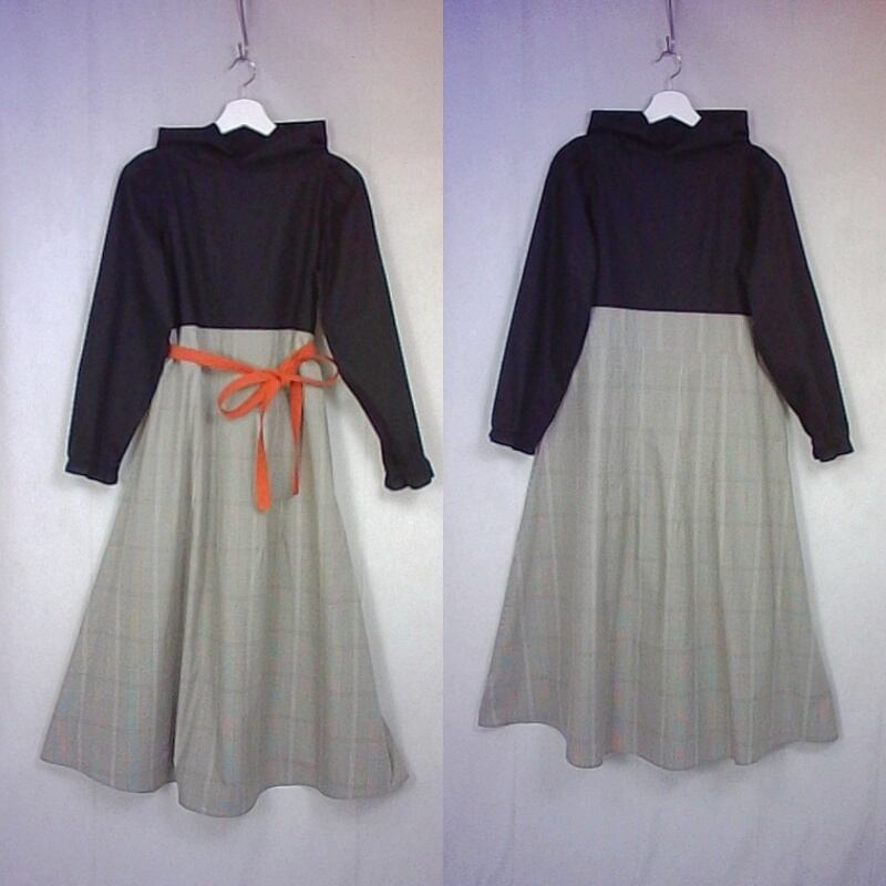 フードワンピース 【hdd00000055】★黒ブラウスとチェックスカートを合わせたような上品な装い オレンジリボンが可愛らしさをプラスする、ミモレ丈のフードワンピース★ 手作り 一点物 快適 通勤 通学 ビジネス 締め付けない 国産 日本製 コットン100% パーカー