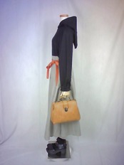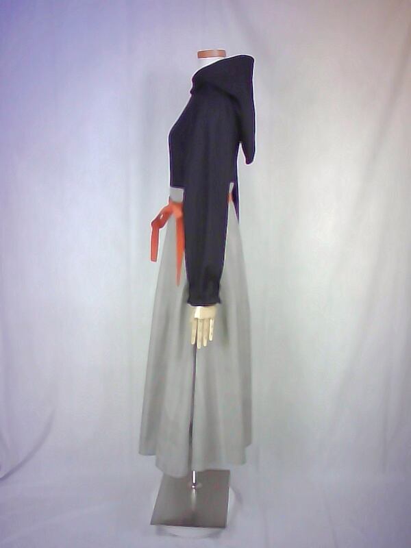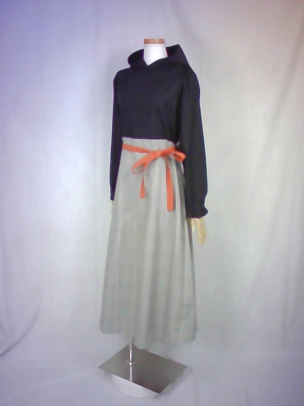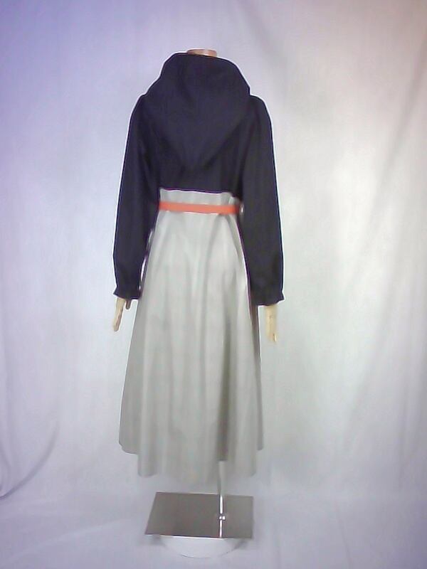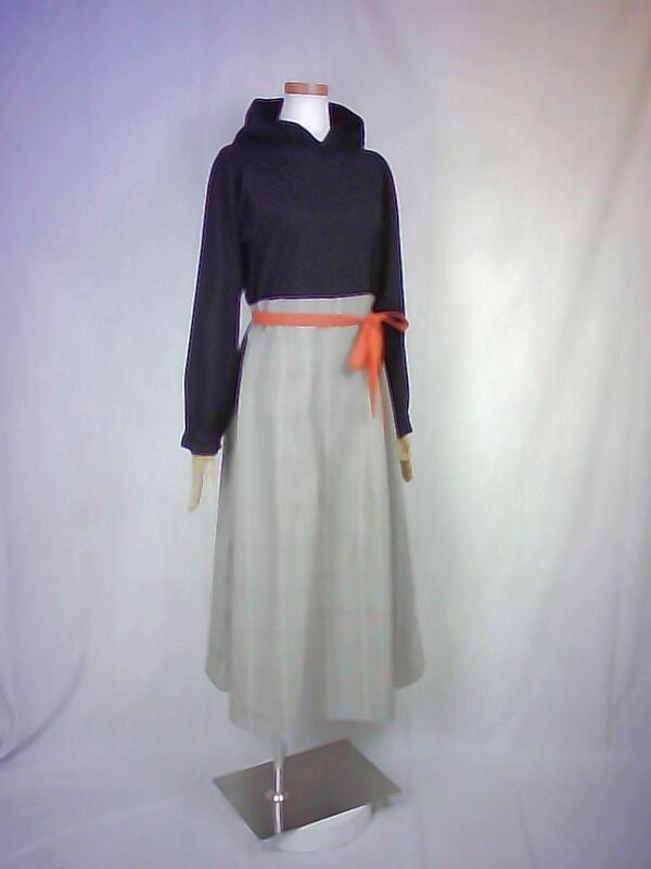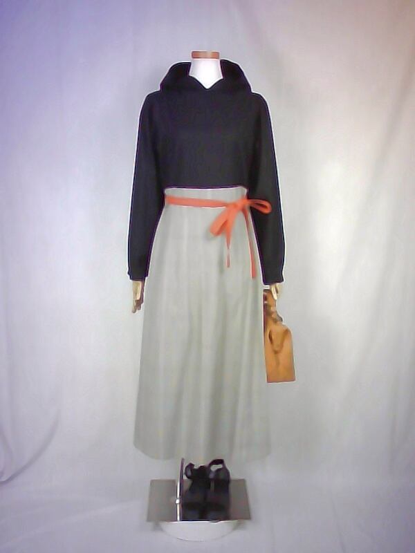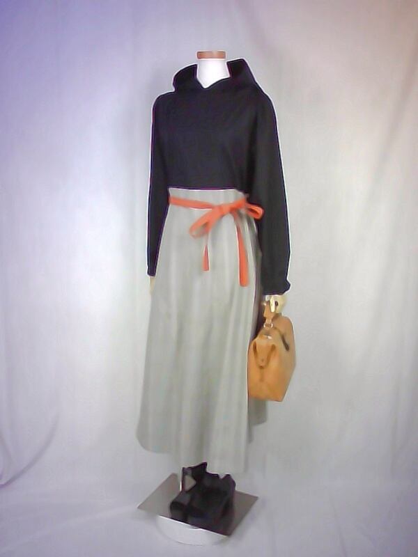 シンプルな黒色のブラウスと、スッキリとしたベージュ色のスカートを合わせた様なフードワンピースは、ウエスト切り替え部分の太ベルト風デザインや、控えめなパフスリーブスカートの綺麗なドレープなどが、上品な大人の雰囲気を演出しています。