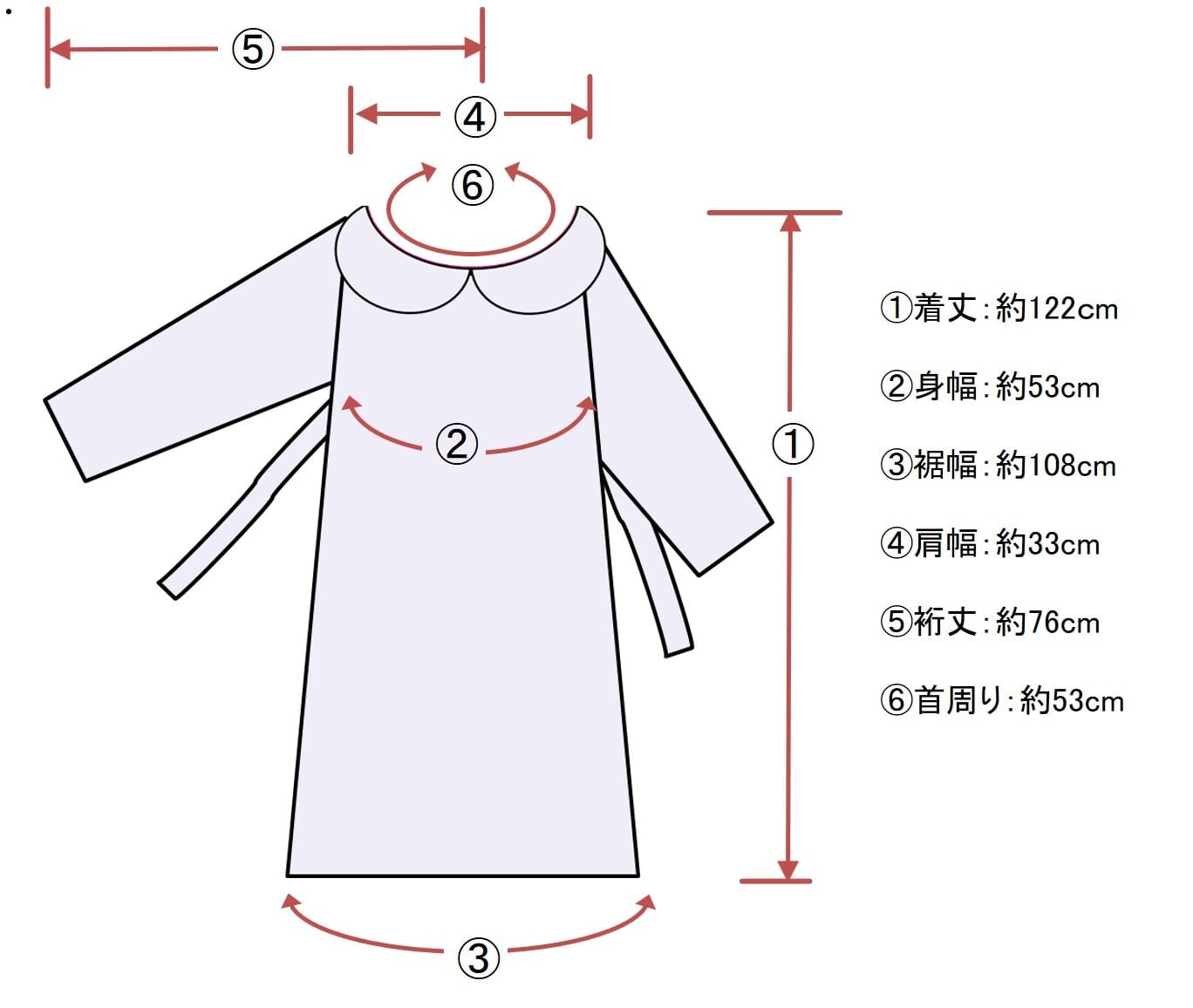 着丈:約122cm 身幅:約53cm 裾幅:約108cm 肩幅:約33cm 裄:約76cm 首周り:約53cm