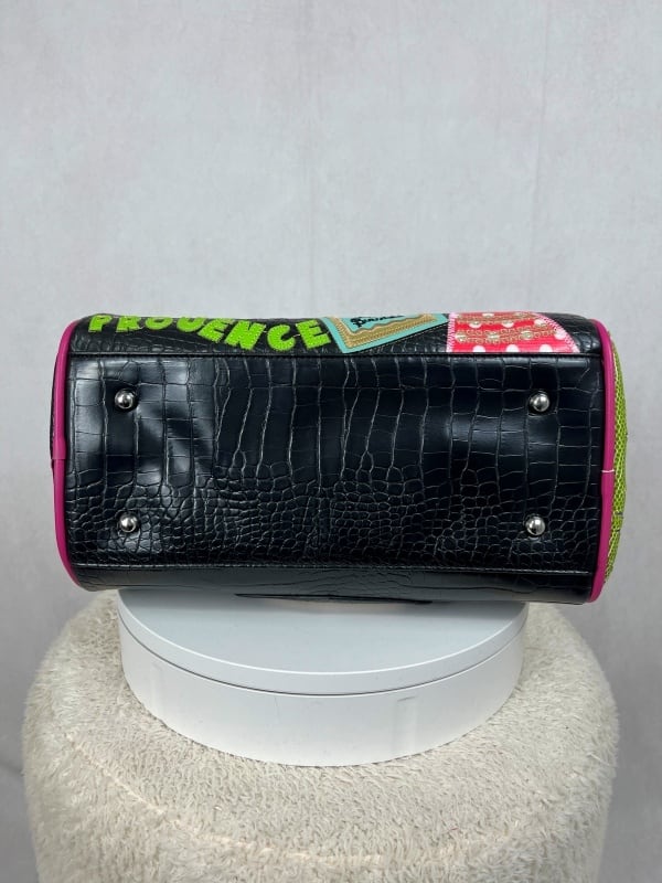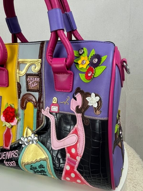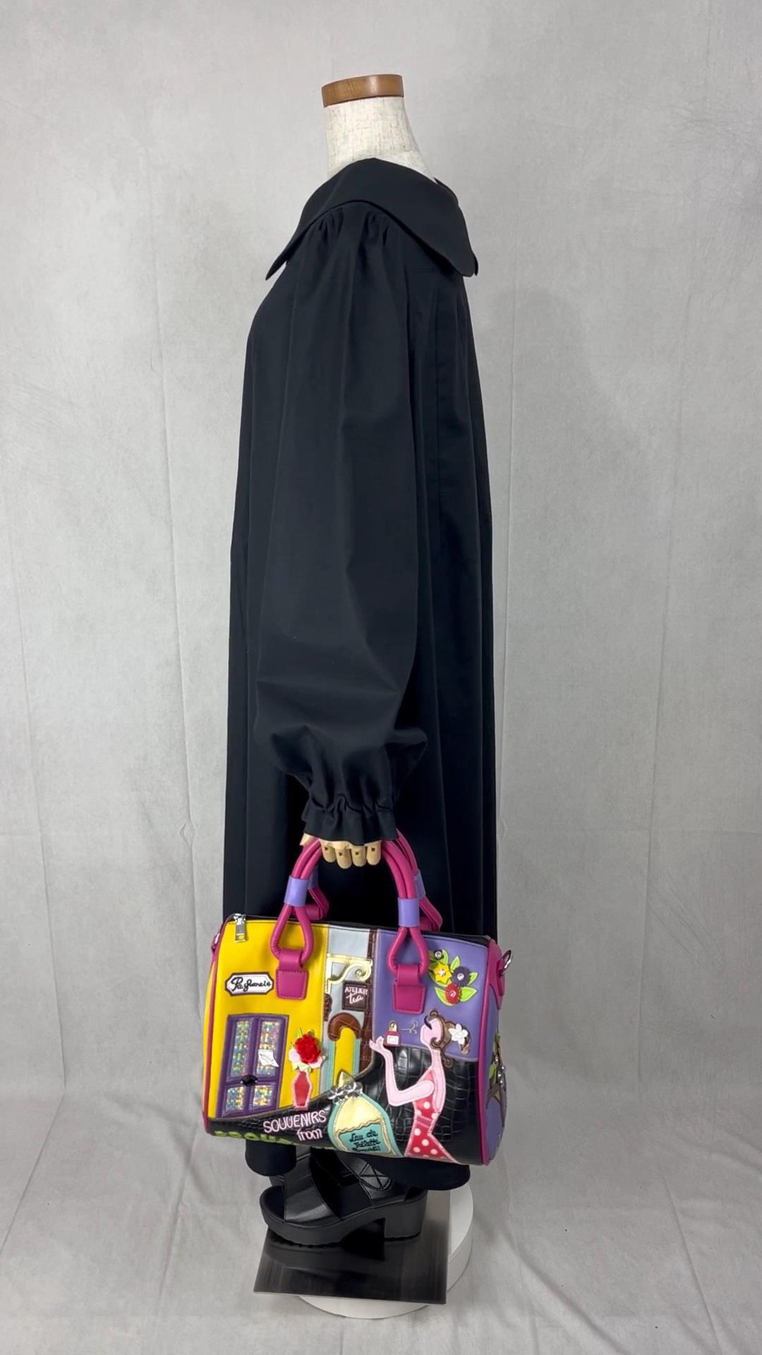 様々な素材を組み合わせた、立体的なデザインがオシャレなボストンバッグでございます。